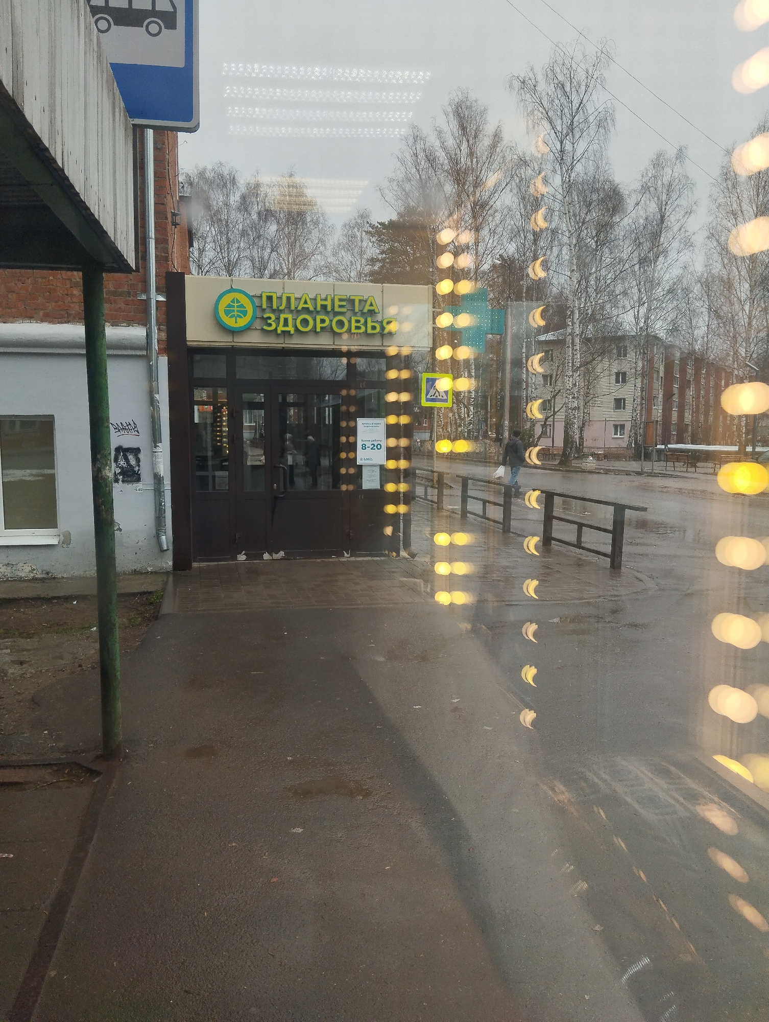 The image shows the exterior of a "Planet Health" pharmacy ("Planeta Zdorov'ya") in Votkinsk, Russia. The pharmacy has a brown entrance with glass doors. Above the entrance, a sign displays the pharma…read more