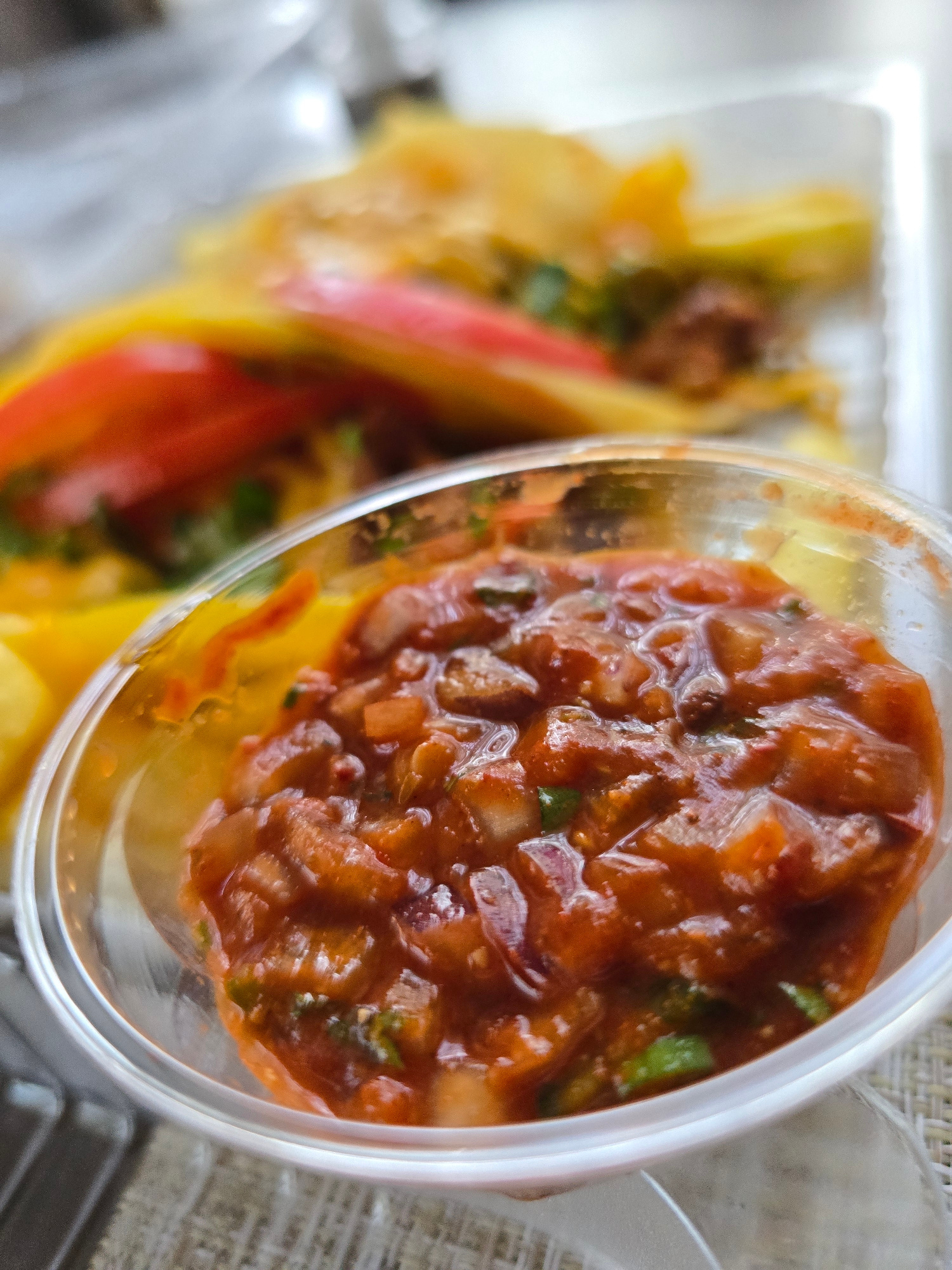 The image shows a close-up of a clear plastic container filled with a red salsa-like sauce. The salsa contains visible chunks of tomato, onion, and green herbs. In the blurred background, there appear…read more