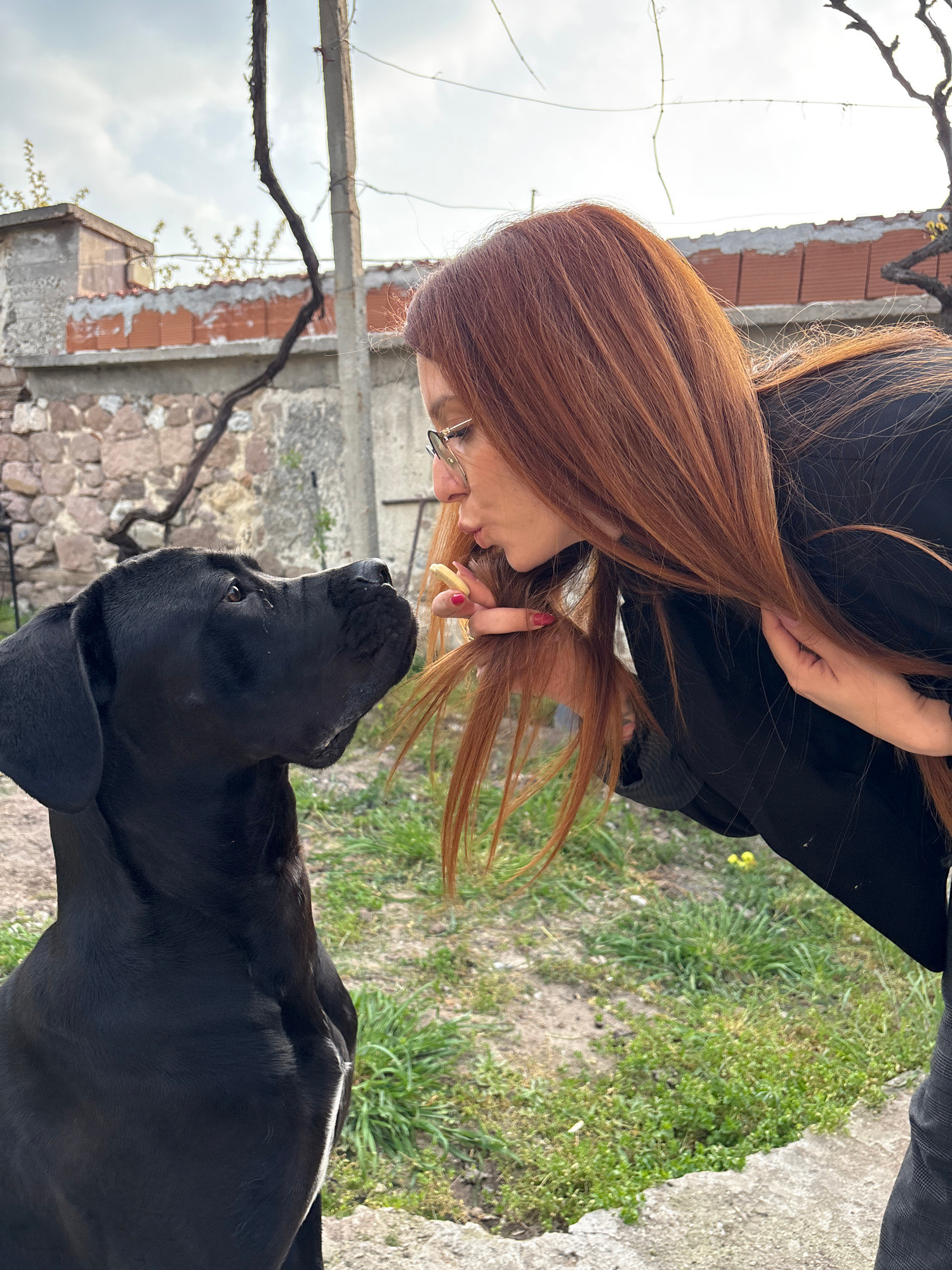 In Perushtitsa, Bulgaria, a woman with long, auburn hair and glasses bends down towards a large, black dog. The woman's hair is partially in the dog's face. She is wearing a black top. Her left hand h…read more