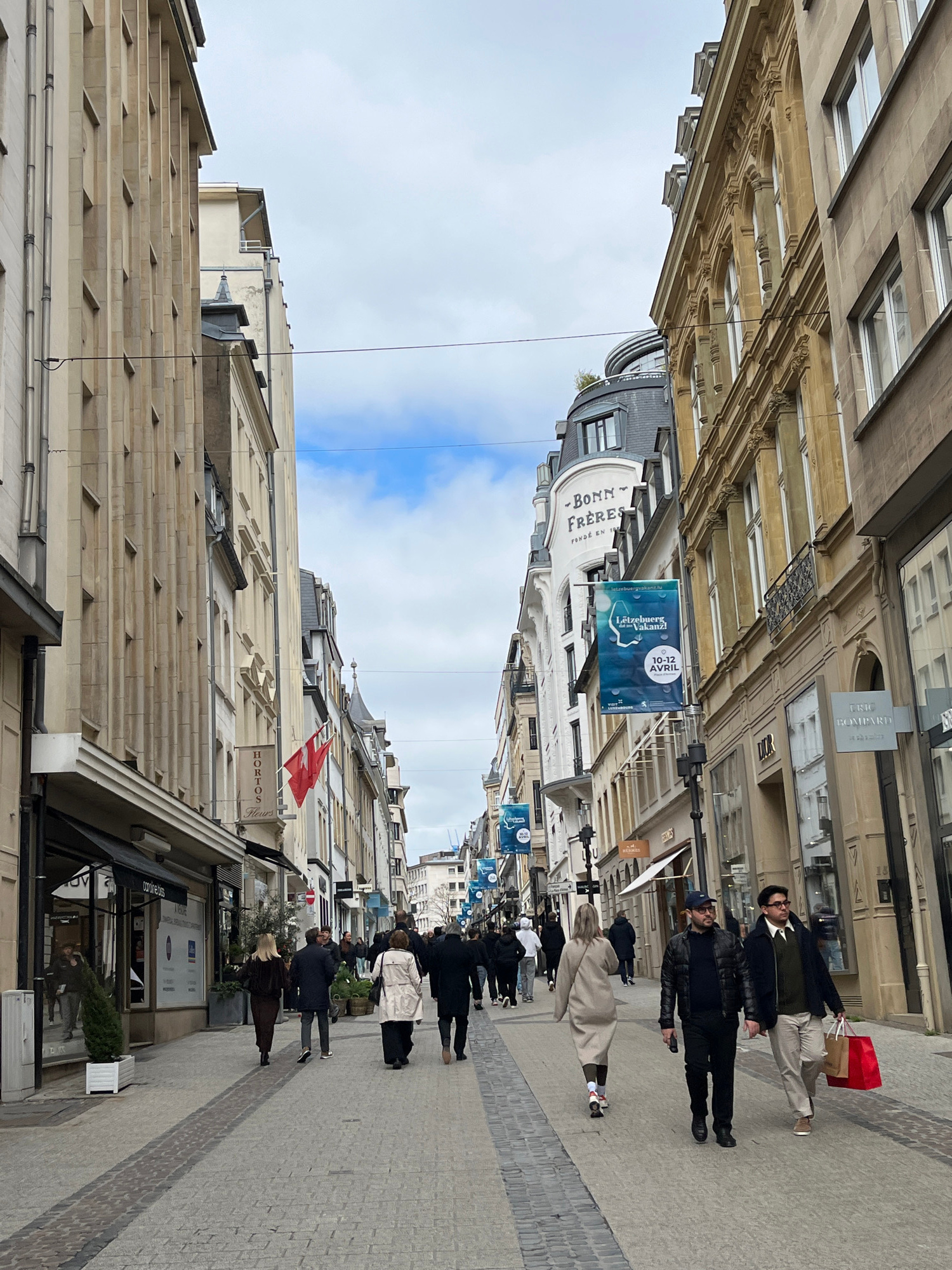 The photograph shows a street scene in Luxembourg City, Luxembourg. People are walking along the cobblestone pavement, and shops line the sides of the street. Banners advertising "Lëtzebuerg am Vakanz…read more