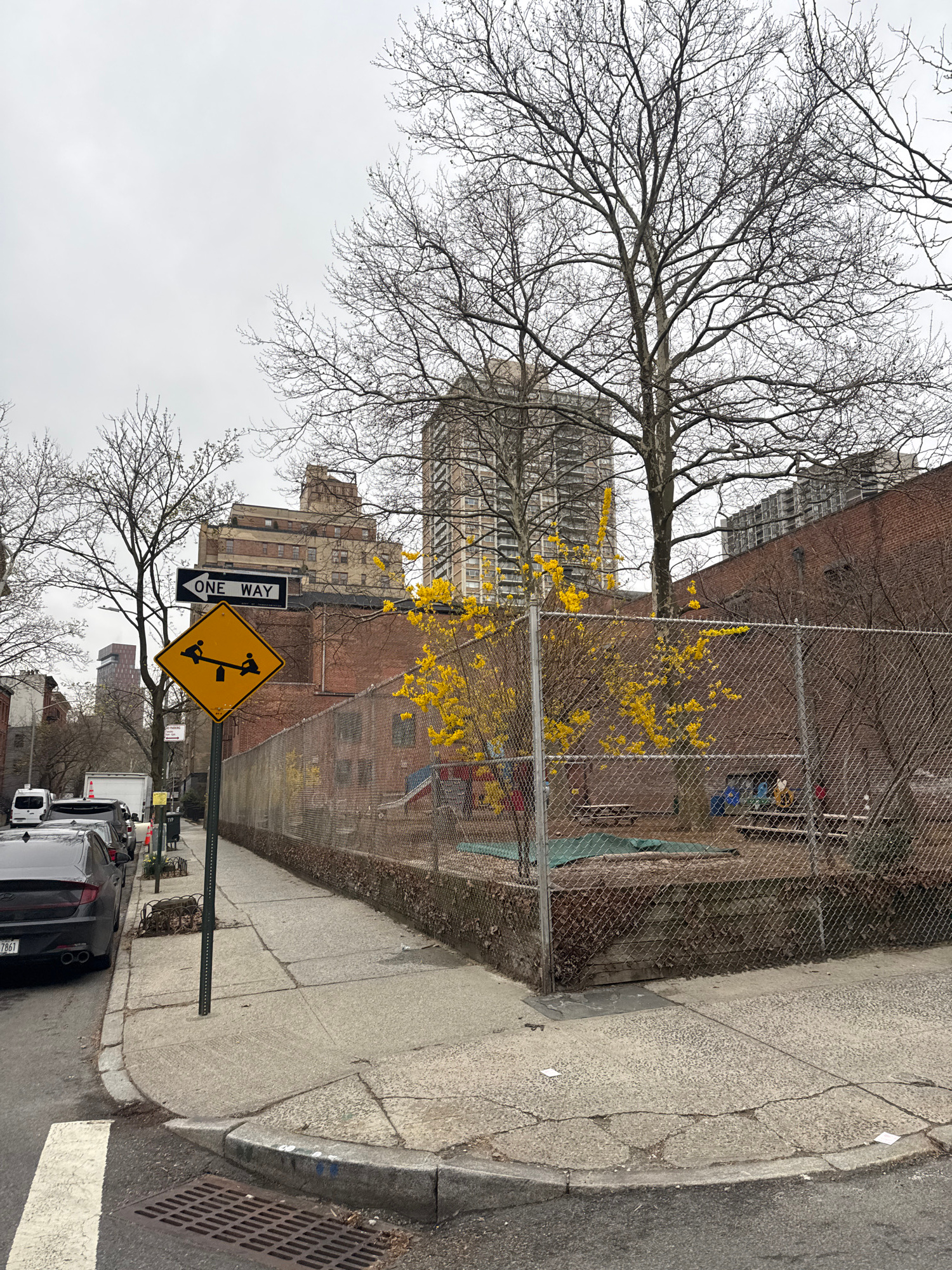 The image depicts an urban street scene in New York City. A "One Way" sign and a yellow warning sign with a seesaw symbol stand prominently on the right side of the street, adjacent to a sidewalk. The…read more