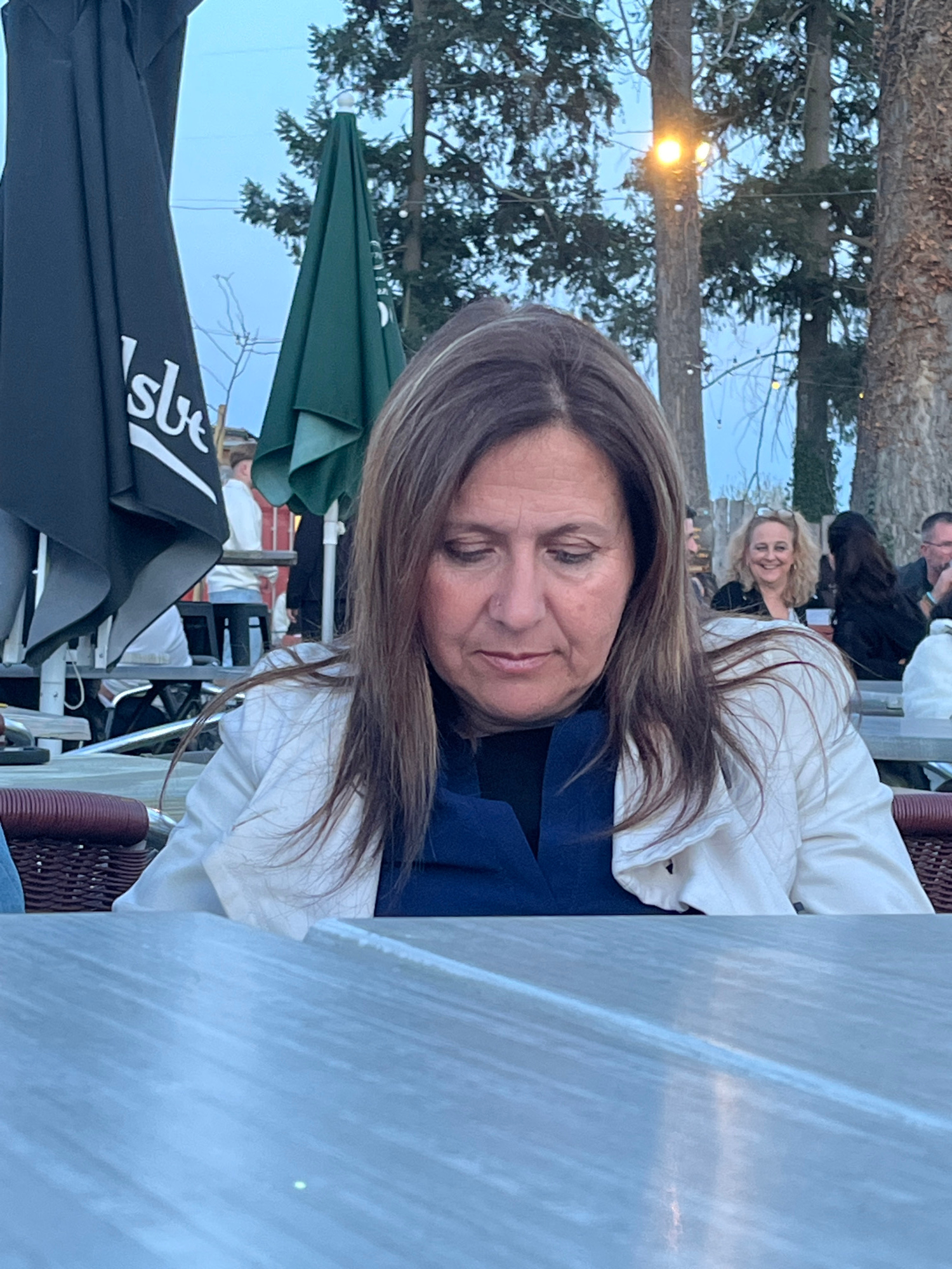 The image depicts a woman with brown hair sitting at an outdoor table. She is wearing a white jacket and a blue top. Another woman with blonde hair can be seen in the background. There are trees and a…read more
