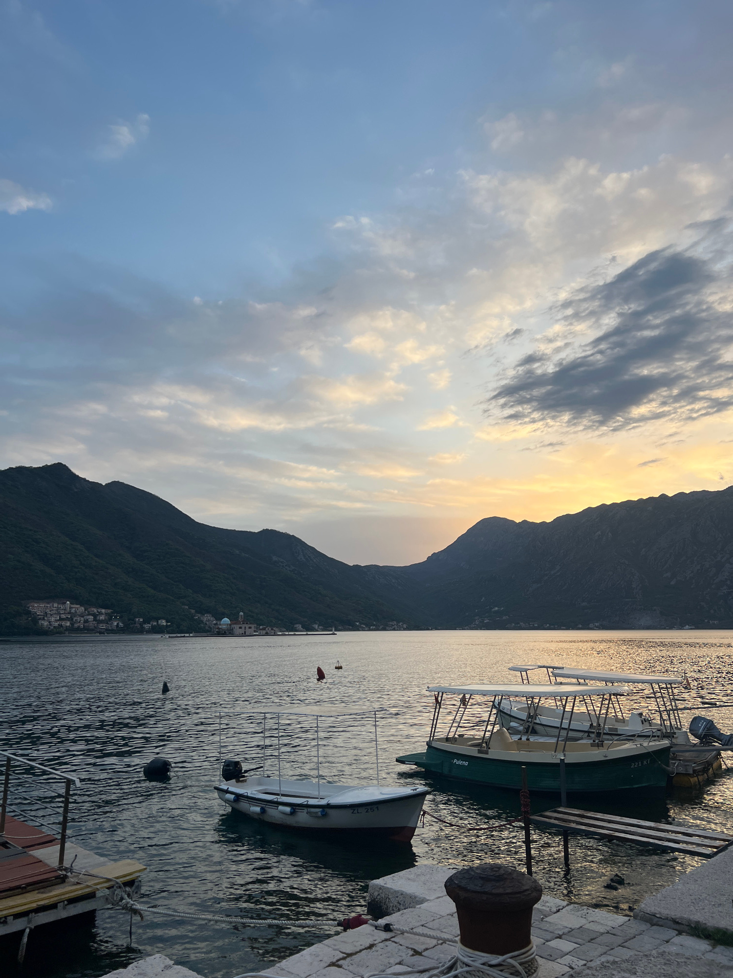 The image depicts a waterfront scene in Perast, Montenegro at dusk. A large, dark mountain range dominates the background. The sky is filled with various shades of clouds, with yellow light near the mβ¦read more