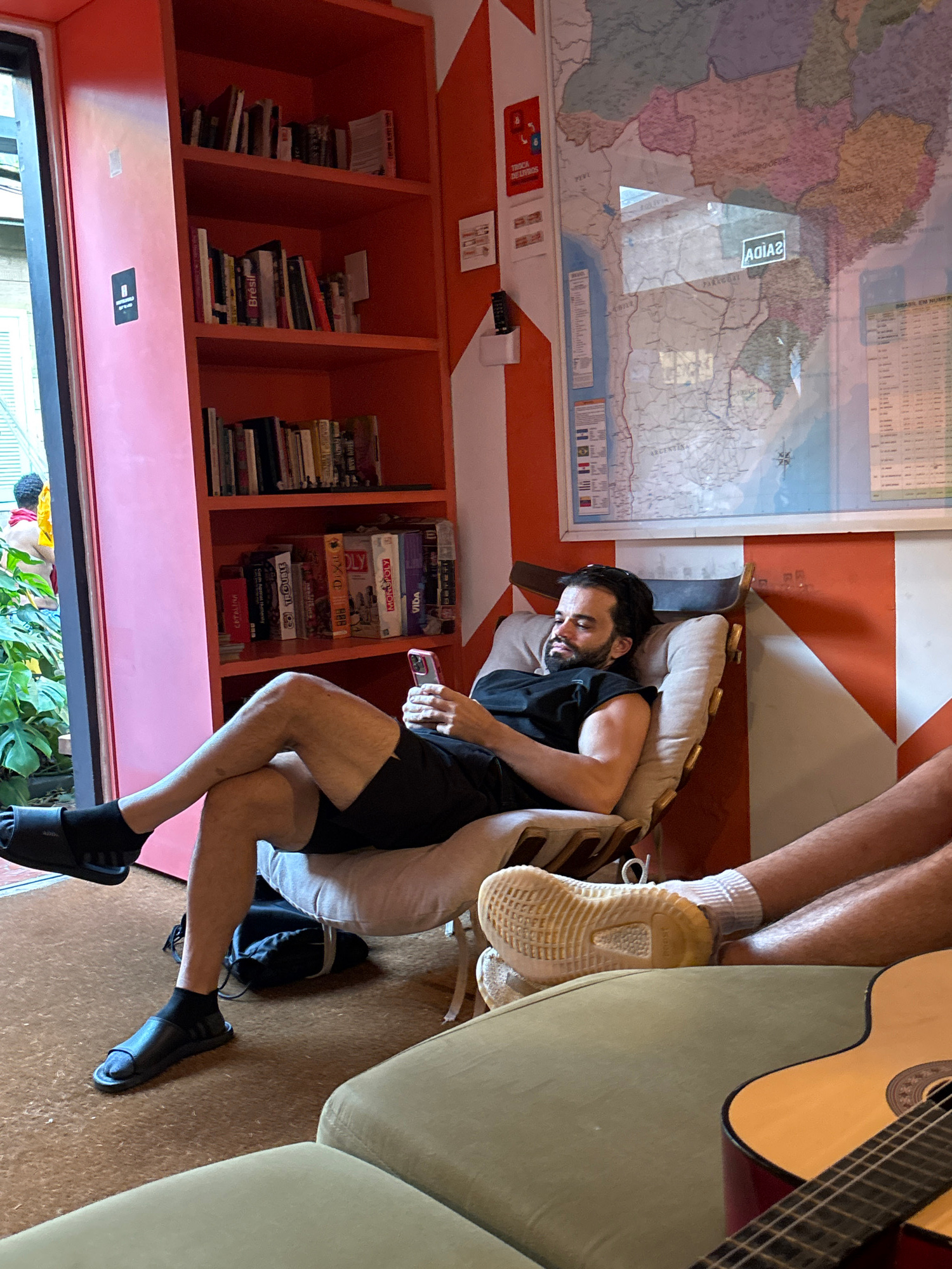 This image captures a relaxed indoor common area, possibly a hostel or lounge, located in São Paulo, Brazil. The scene features two men in a casual setting. One man, with a beard and dark hair, is res…read more