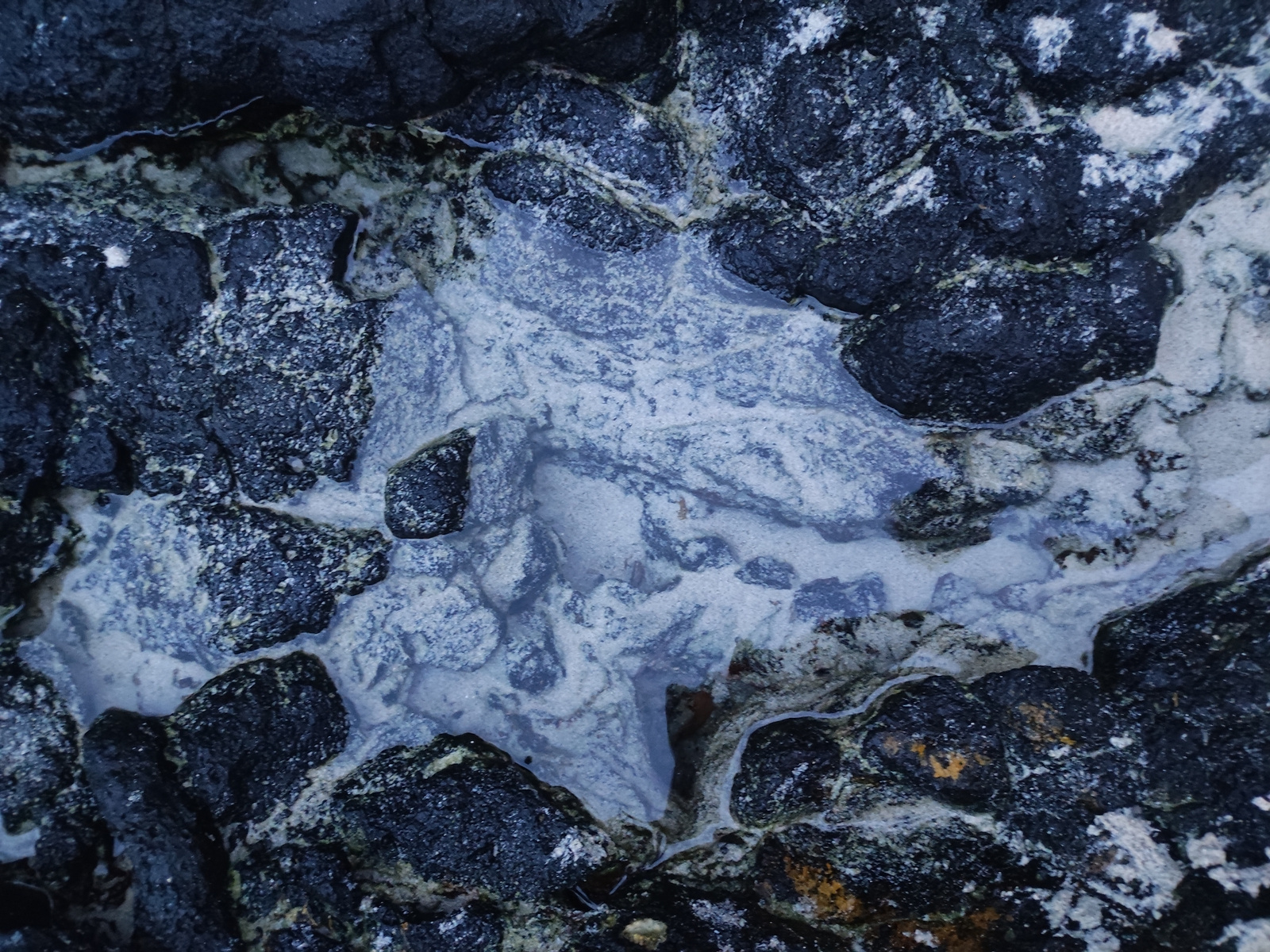 The image depicts a close-up view of a rocky terrain. The rocks are primarily dark, with varying textures and colors, some with a slightly glossy or wet appearance. A central depression or pool filledβ¦read more