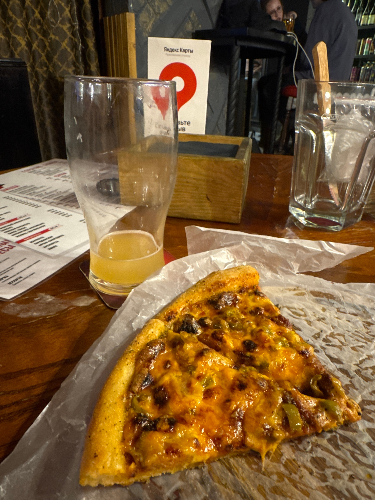 The image shows a slice of pizza, likely from the 1932 ЭСКИЗЫ restaurant located in Chaikovsky, Russia, judging by the menu visible. The pizza is on a paper liner. A glass of beer or cider sits next t…read more