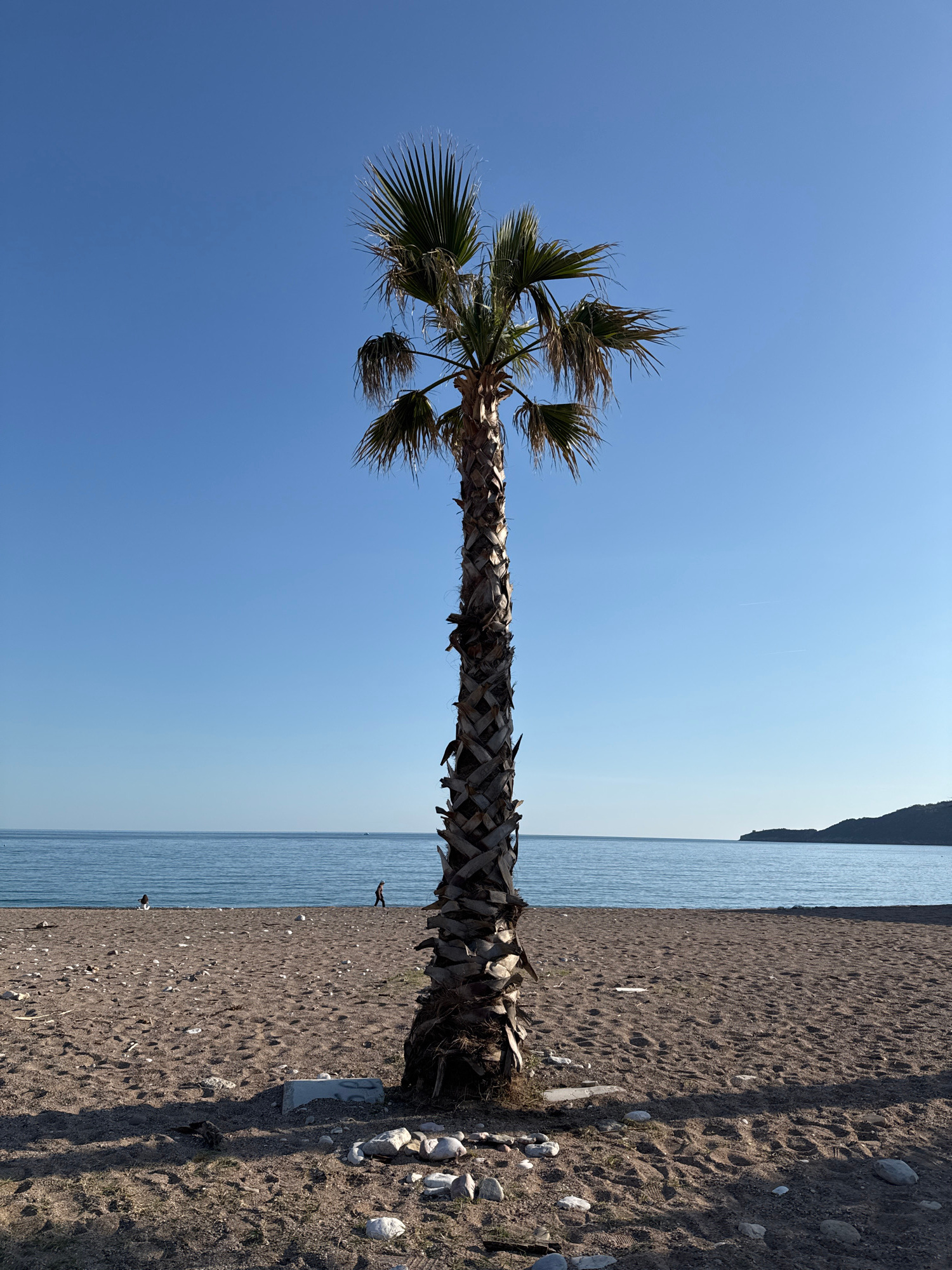 A vertical landscape shot shows a palm tree on a beach in Bečići, Montenegro. The tree's trunk is thick, covered in fibrous material, and leans slightly to the right. Its fronds are a mix of green and…read more