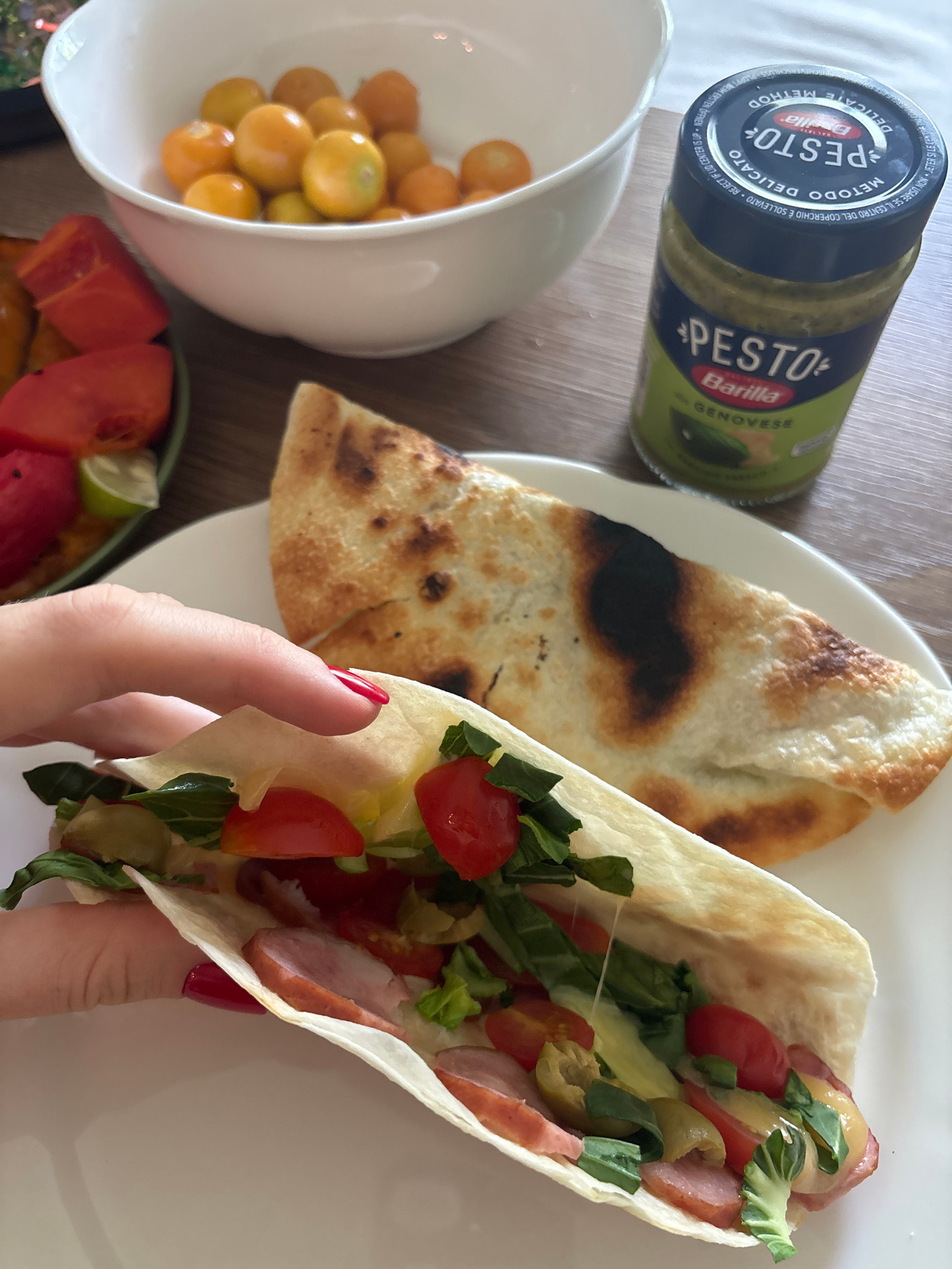 This close-up, overhead photograph captures a casual meal laid out on a light wooden surface, likely indoors in Choeng Thale, Thailand. The central focus is a hand with red nail polish holding a softโฆread more