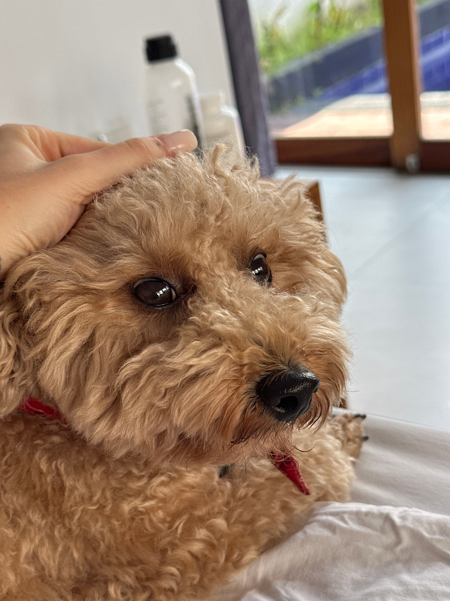An indoor scene in Dalung, Indonesia, features a medium-sized dog with light brown, curly fur, wearing a red collar, resting on white bedding. A human hand, light-skinned with manicured fingernails an…read more