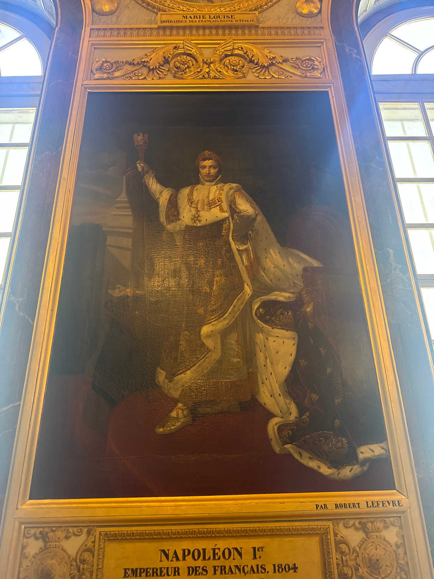 The image shows the "Napoleon I in Coronation Robes" painting by Robert Lefevre, dated 1804. The painting depicts Napoleon in his imperial regalia. It is housed in Versailles, France, inside the Palac…read more