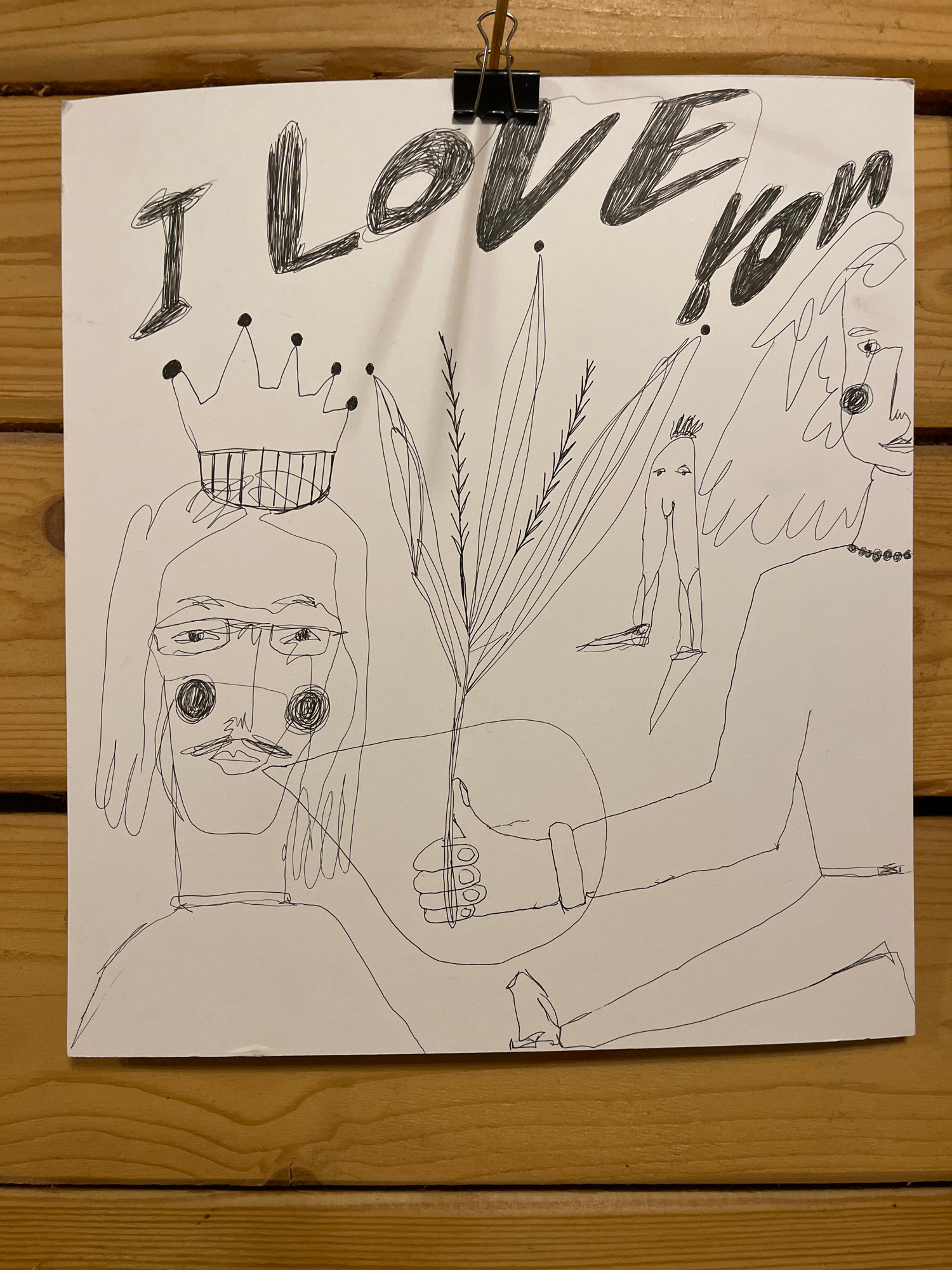 The image features a continuous-line drawing on a white sheet of paper, fastened by a black binder clip to a light brown wooden surface. The photograph shows the paper rotated 90 degrees clockwise, bu…read more