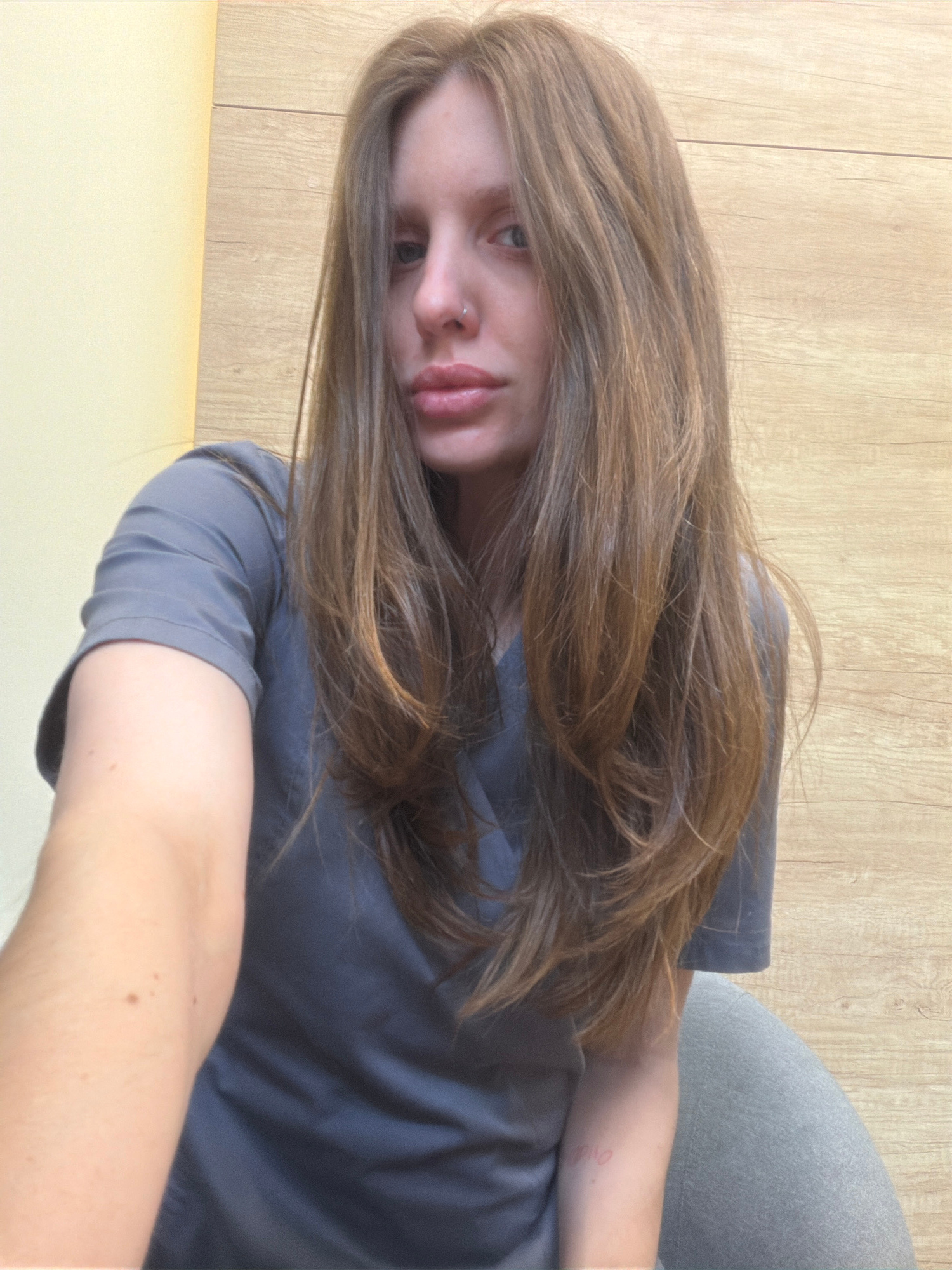 A woman with long, brown hair is centered in the frame, wearing a gray shirt. She has fair skin and a pierced nose. She is looking at the camera. Behind her is a wall with two different sections: the…read more