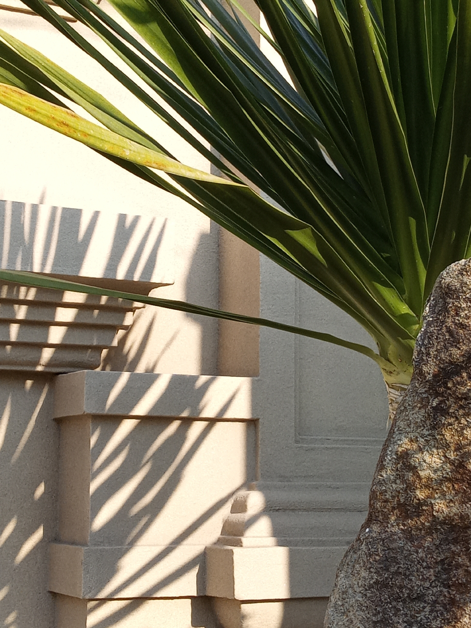 A close-up shot reveals a Yucca plant situated beside a light-colored building in Bắc Nha Trang, Vietnam. Sunlight casts sharp shadows of the plant's leaves onto the building's textured facade. The bu…read more