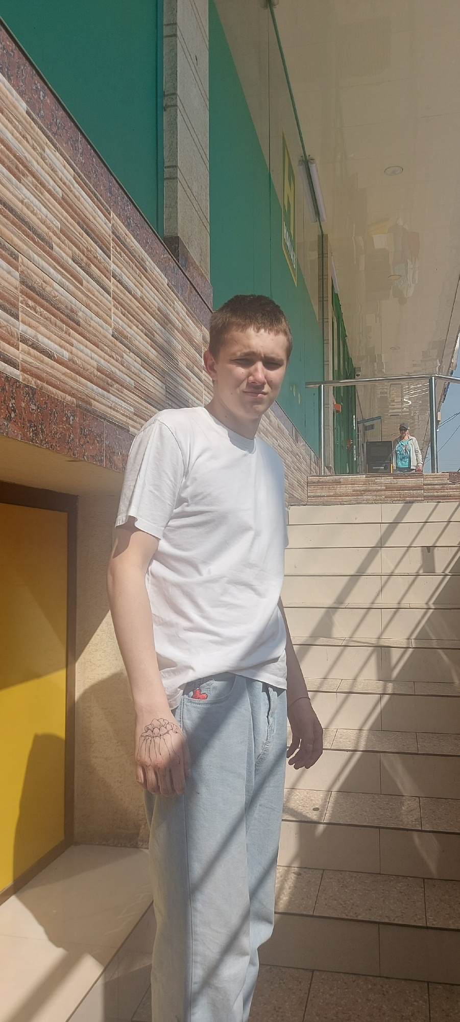A person lies on a ledge in an urban setting. The ledge is tiled with beige and brown rectangular tiles. The person wears a white t-shirt and light blue denim pants. A hand with a tattoo that resemble…read more