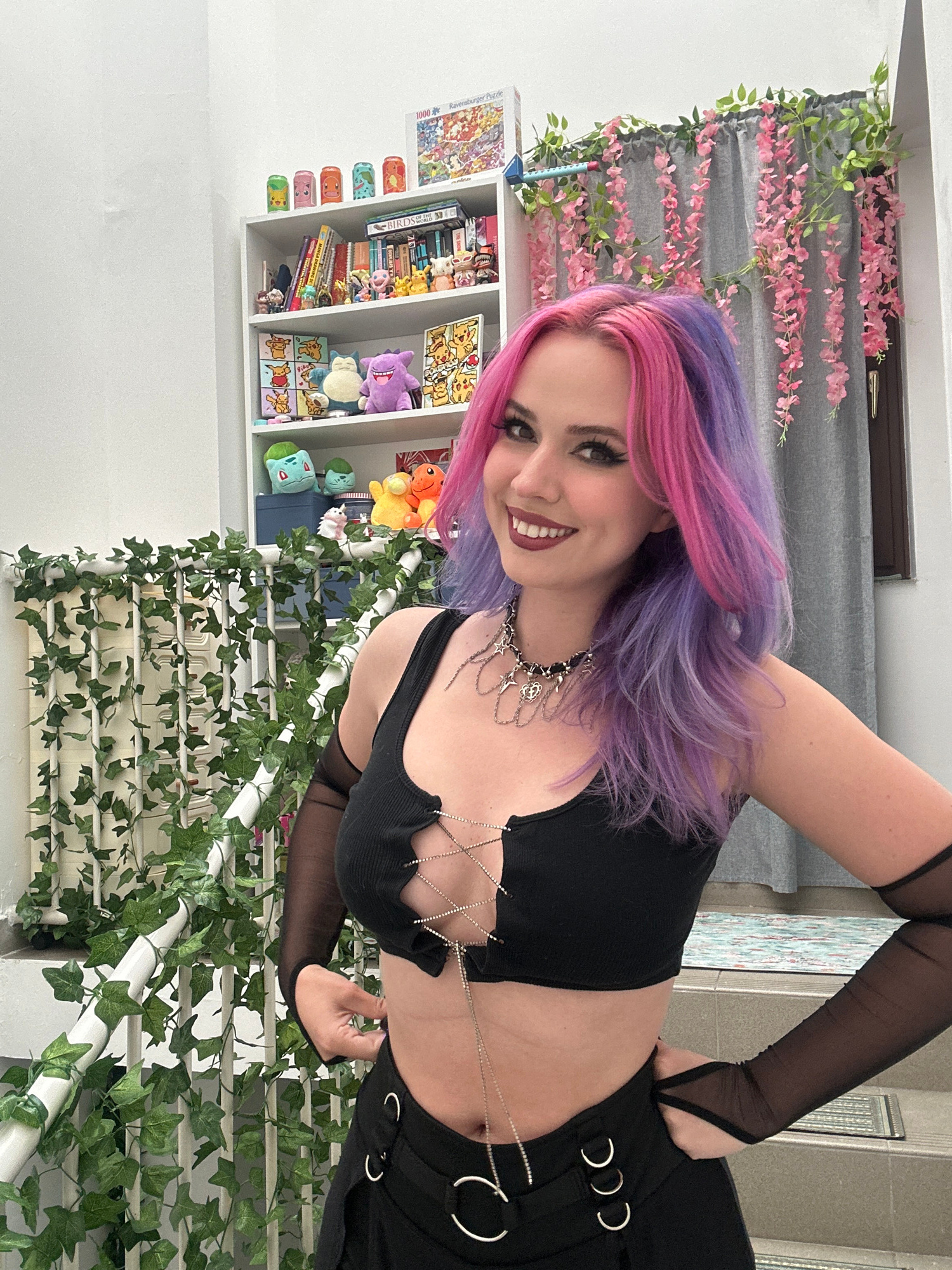 A woman with dyed purple and pink hair stands indoors next to a white bookshelf filled with books, games, and stuffed animals, as well as a white railing covered in artificial ivy. She wears a black c…read more
