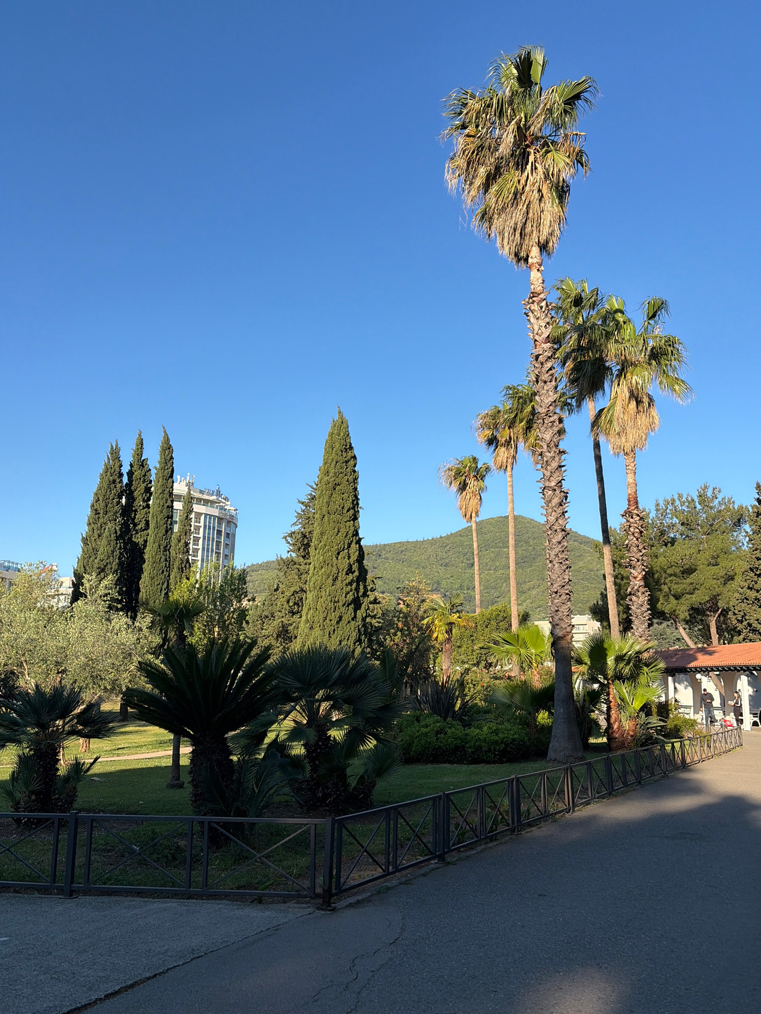 The image presents a scene in Budva, Montenegro, characterized by a blend of tropical and Mediterranean vegetation alongside urban development. A row of tall palm trees with mature fronds dominates th…read more