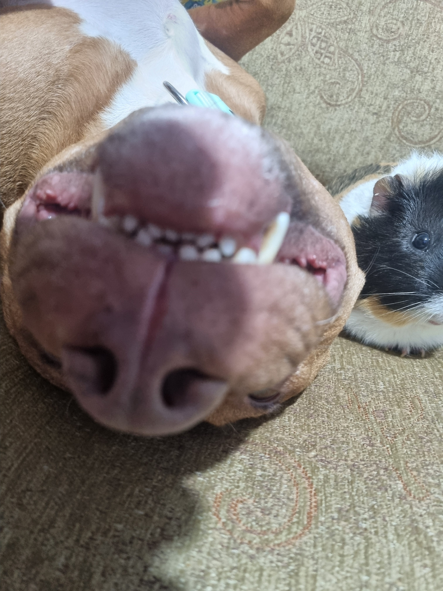 The image shows a close-up view of a dog's face, particularly its mouth and nose, upside down. Its teeth are visible. Behind the dog's head is a guinea pig. Both are lying on a textured brown surface,…read more