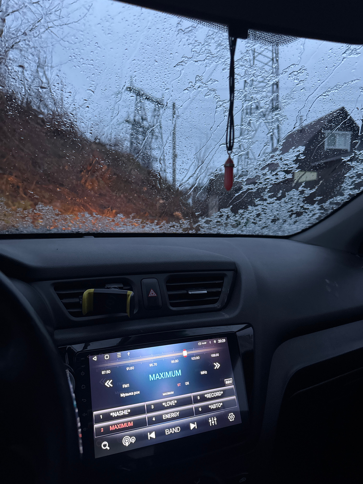 The image, taken from inside a vehicle, shows a rainy windshield with visibility obscured by water droplets. Through the windshield, a blurred landscape is visible, including a building and power lines, suggesting an urban or suburban environment. Inside the vehicle, the dashboard is visible, featuring air vents, a hazard light button, and a modern infotainment system displaying a radio interface tuned to a station called "MAXIMUM" and other FM stations. Based on the "Музыка рок" ("Music Rock") label and the FM frequencies displayed, it's possible the location is Chaikovsky, Russia. | Open Wire