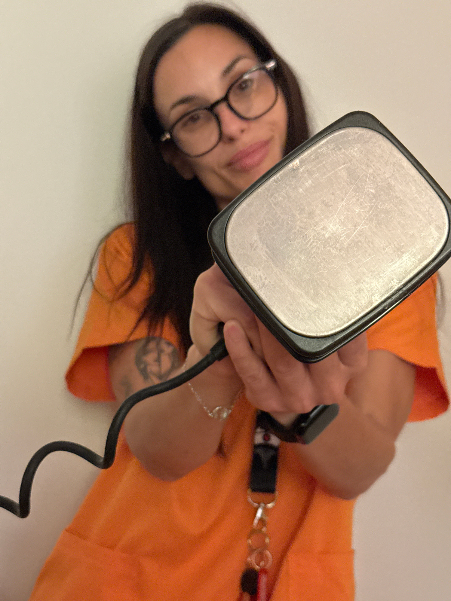 The image, originally oriented sideways, presents a close-up view of a woman holding a defibrillator paddle. The woman, who has long dark hair and wears round glasses, looks towards the camera with a…read more