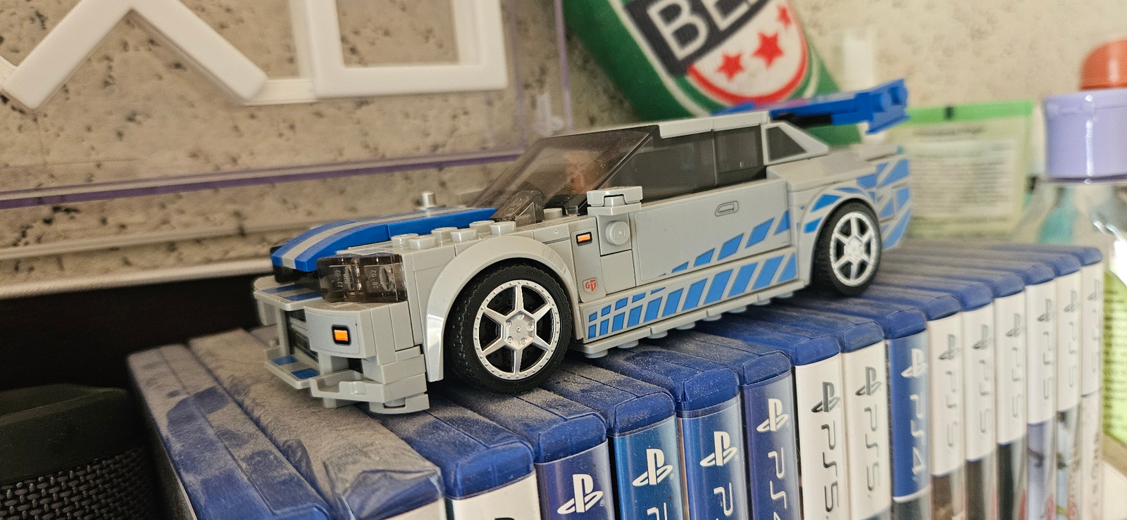 A Lego model of a car, specifically a Nissan Skyline GT-R from the Fast & Furious franchise, sits atop a stack of blue-cased PlayStation 5 game boxes. The car is light grey with blue racing stripes. T…read more