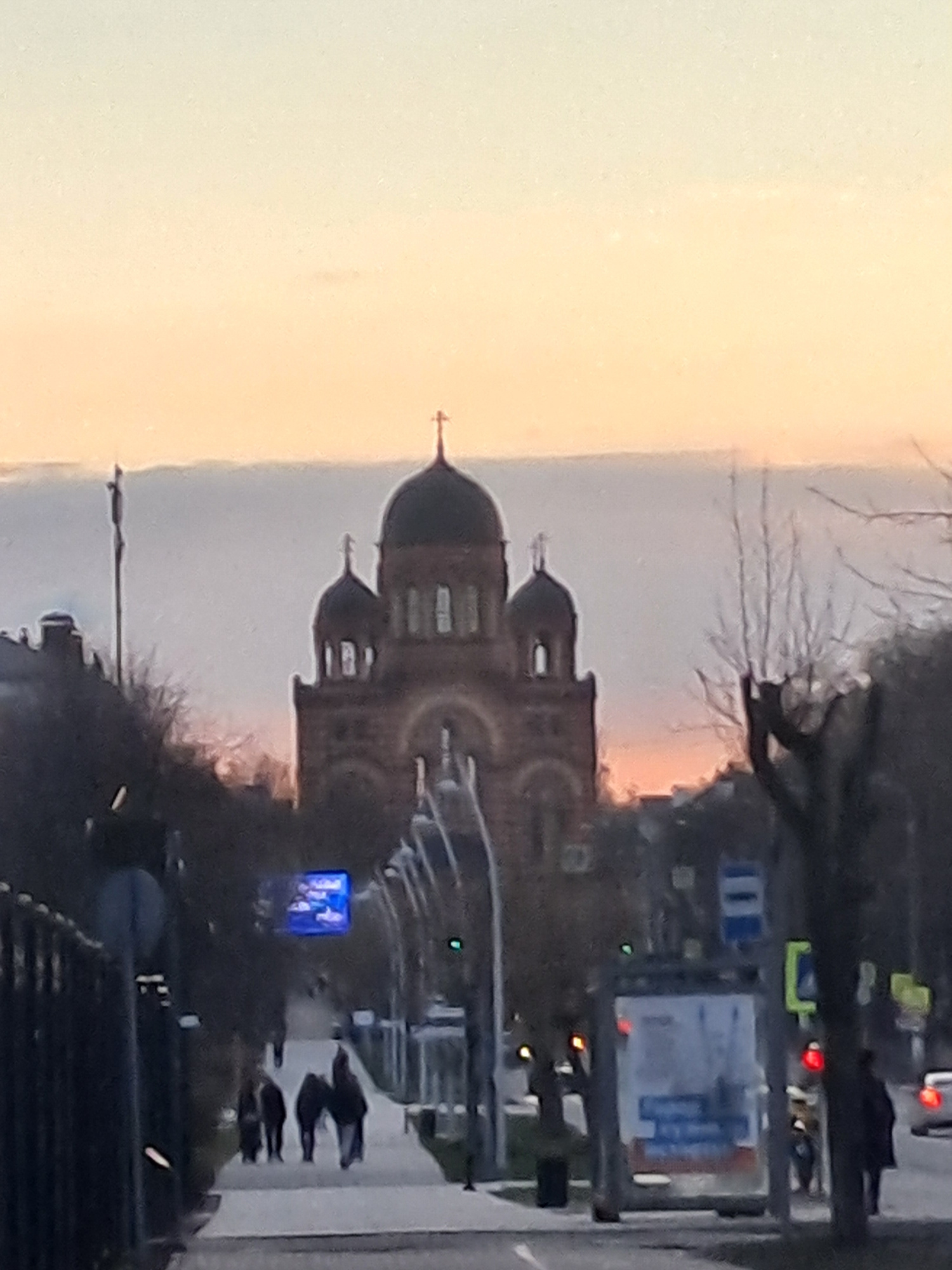 The image shows a blurry street scene in Elektrostal, Russia. An Orthodox church with onion domes is visible in the background against a hazy sky. Street lights, traffic signals, and road signs are pr…read more