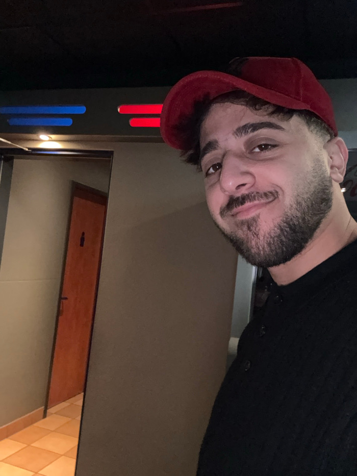 A man with a beard and a red cap is smiling. He wears a black button-up shirt. Behind him is a gray wall. There's a decorative pillar with red and blue vertical lights to his left. A mirror shows a reβ¦read more