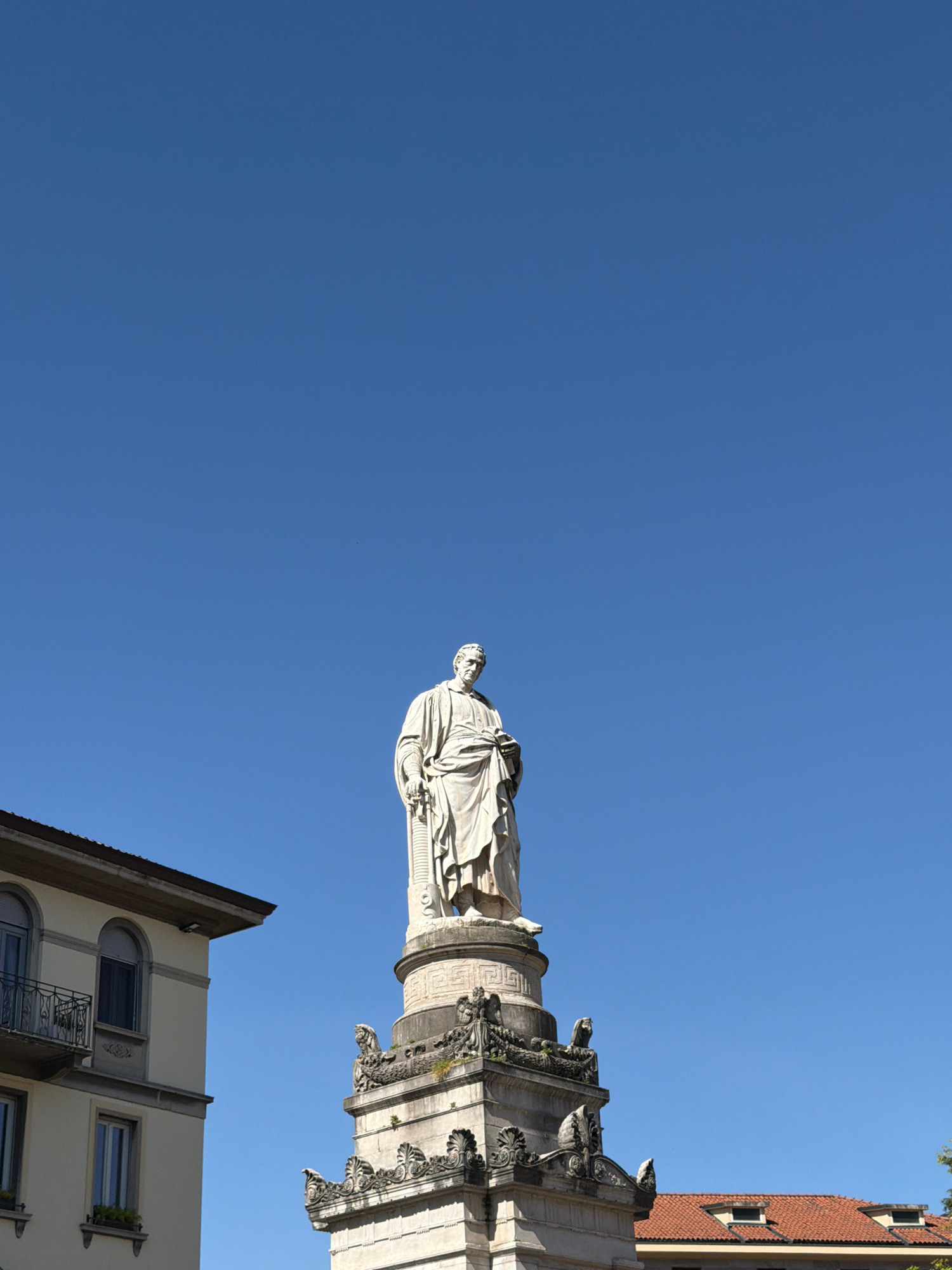 The image depicts a statue atop a column in the city of Como, Italy. The statue is white and appears to be of a historical figure. The column is ornate with decorative elements. The sky is a clear blu…read more