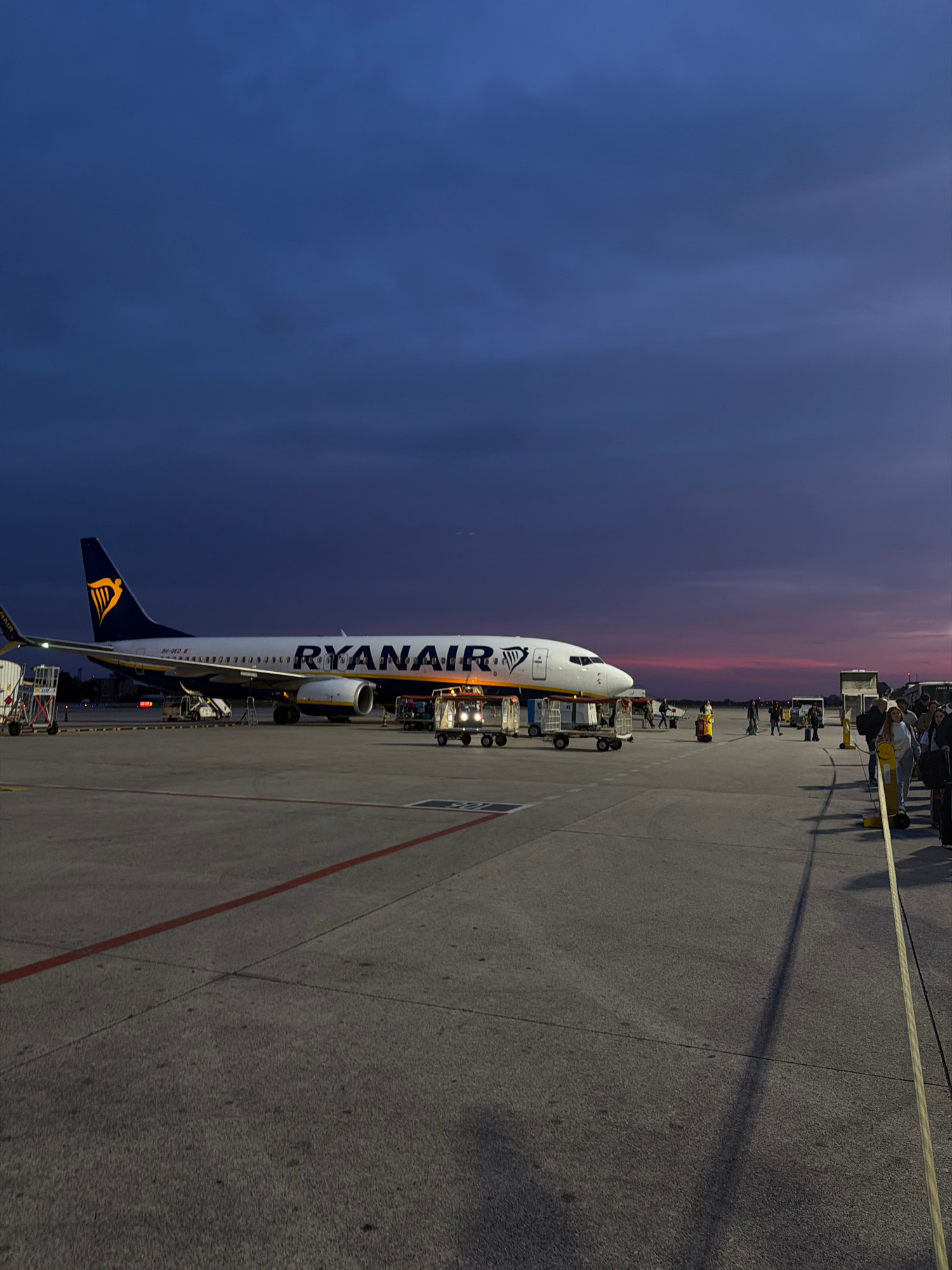 The image depicts a Ryanair Boeing 737 aircraft parked on the tarmac at an airport at dusk. The sky transitions from a deep blue to a reddish-orange horizon. Ground crew are positioned around the airc…read more