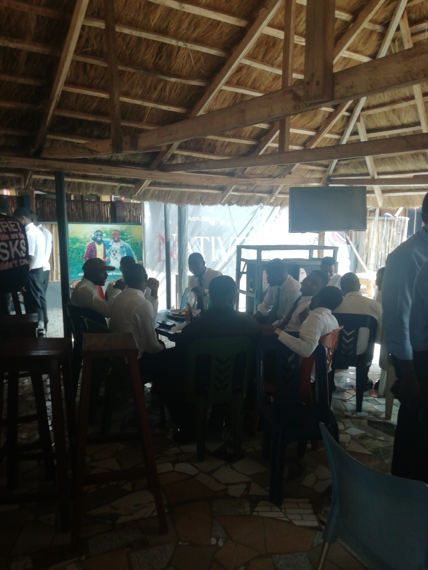 The image depicts an indoor scene in what appears to be a restaurant or bar in Enugu, Nigeria. The roof is thatched, with visible wooden beams supporting the structure. Several men are seated at tableβ¦read more