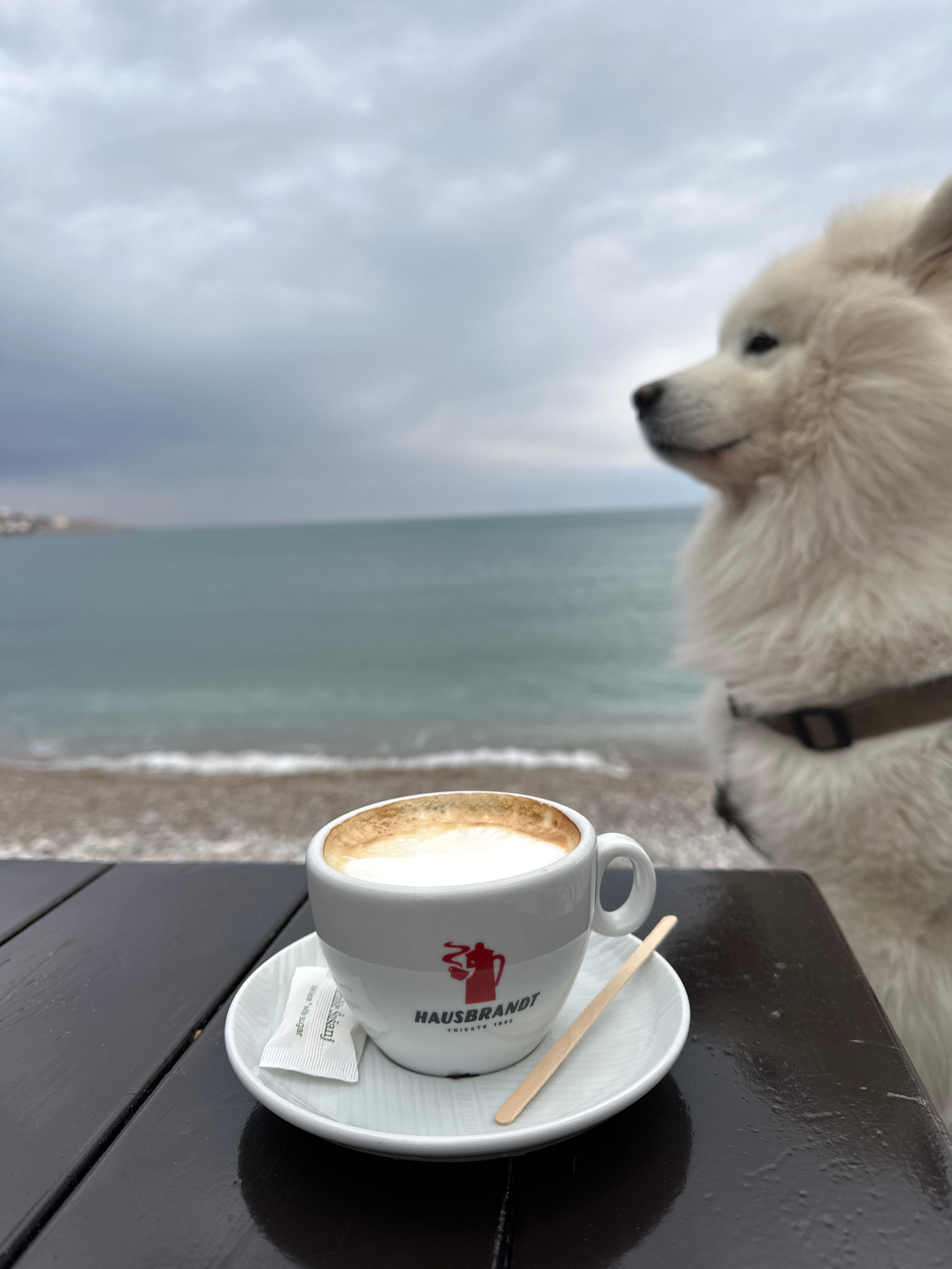 A cup of cappuccino sits on a black wooden table, accompanied by a small packet of white sugar and a wooden stirrer, at an outdoor cafe. The cup is branded with "HAUSBRANDT TRIESTE 1892". The backgrou…read more