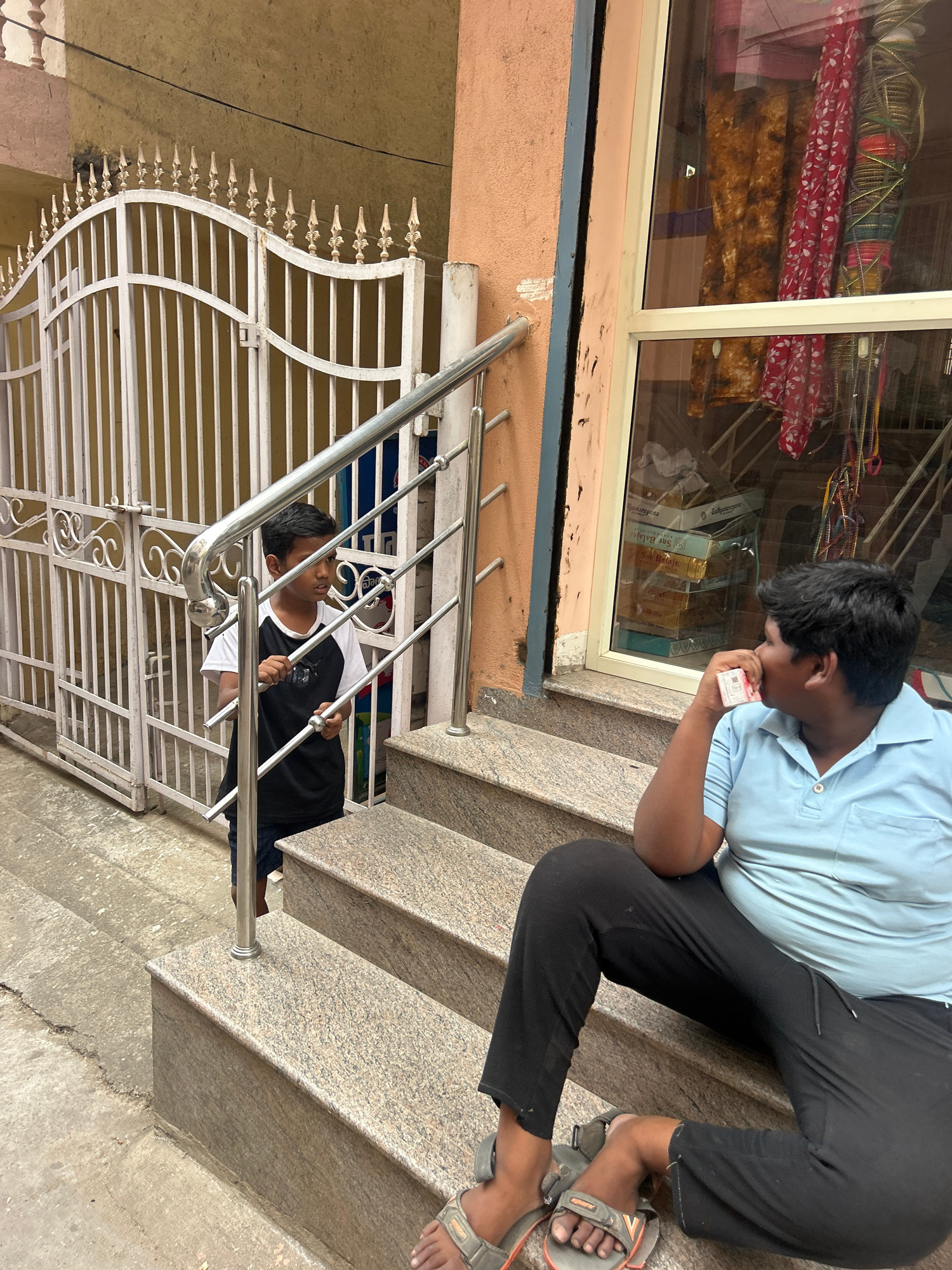 A man wearing a light blue polo shirt and black pants is sitting on the granite steps outside a building. He is holding a small white object in his right hand near his face. He is wearing sandals. Ano…read more