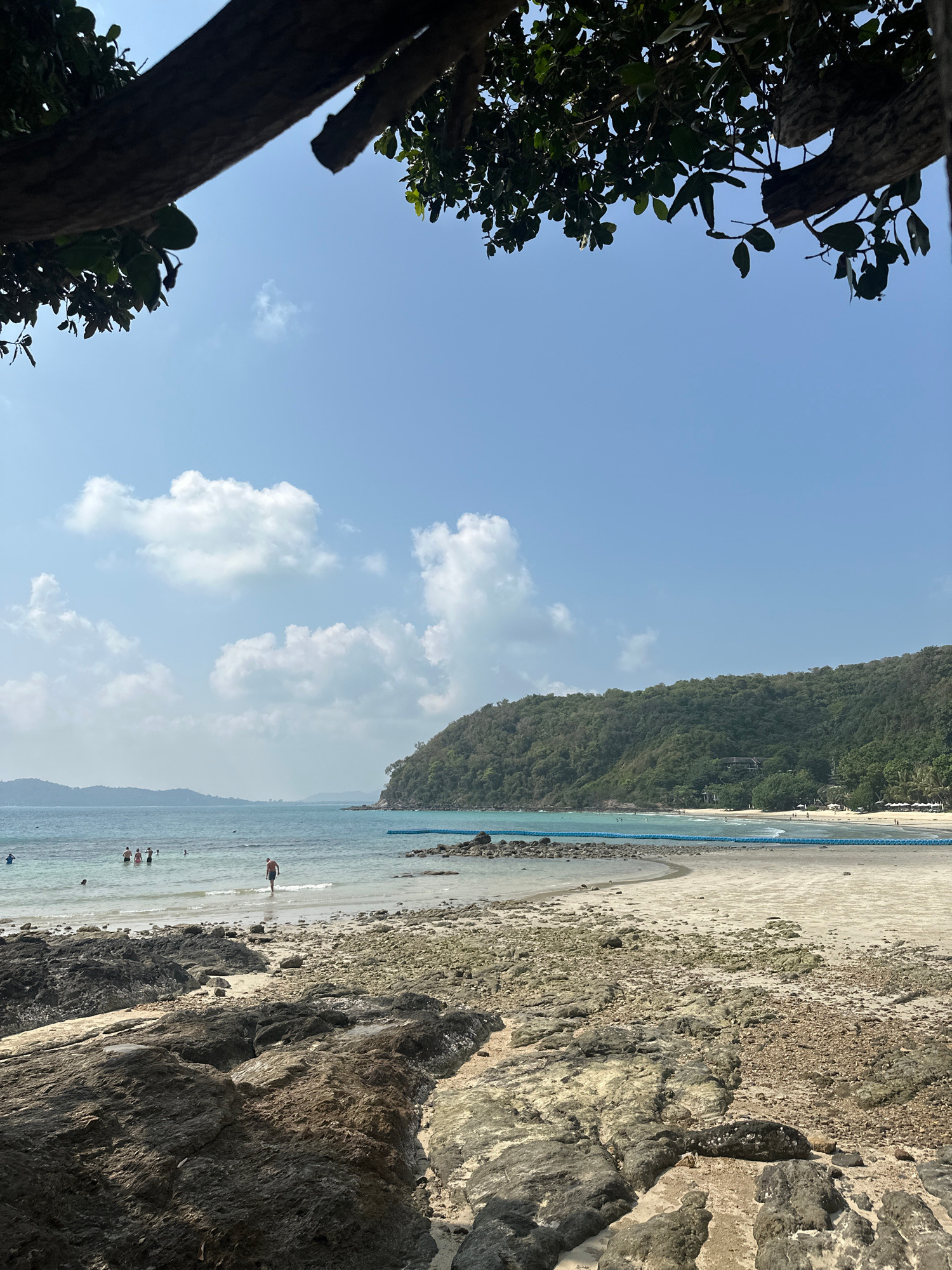 A beach in Ao Luk, Thailand is seen in an outdoor shot, where a tree and rock formation are visible in the foreground. The beach, water, and coastline with forest and a blue fence in the middle are vi…read more