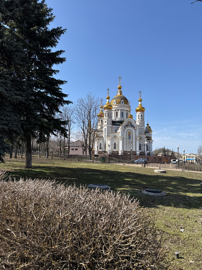 The image displays the Cathedral of the Transfiguration of Jesus in Donetsk, Ukraine, under a clear blue sky. The cathedral, a prominent Eastern Orthodox structure, features white/light grey facades,…read more