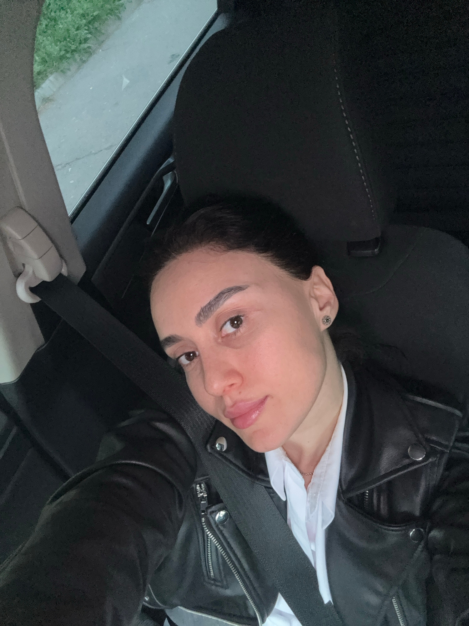 A woman is in the driver's seat of a car, wearing a black leather jacket and a white shirt. She is wearing her seatbelt. The scene appears to be inside a vehicle, possibly located in Tbilisi, Georgia,…read more