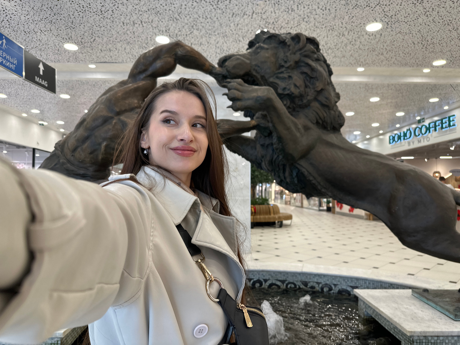 A selfie captures a young woman standing amidst large bronze statues in a spacious indoor setting, likely a shopping mall or public building. The woman, positioned centrally, looks down at the camera…read more