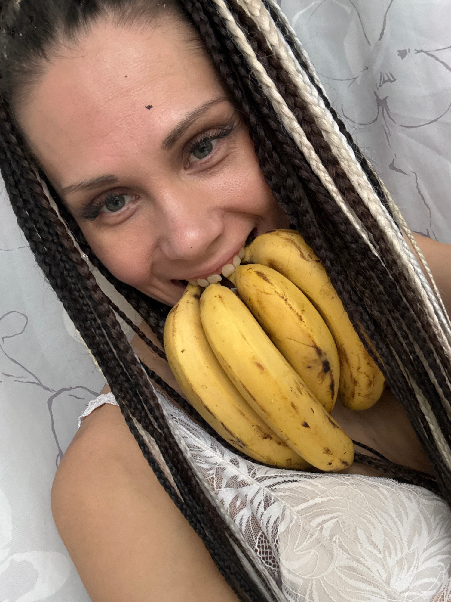 A woman lies supine on a bed covered with a patterned white sheet. Her face is close to the camera, revealing light-colored eyes, brown eyebrows, and dark braided hair with blonde strands. She is hold…read more