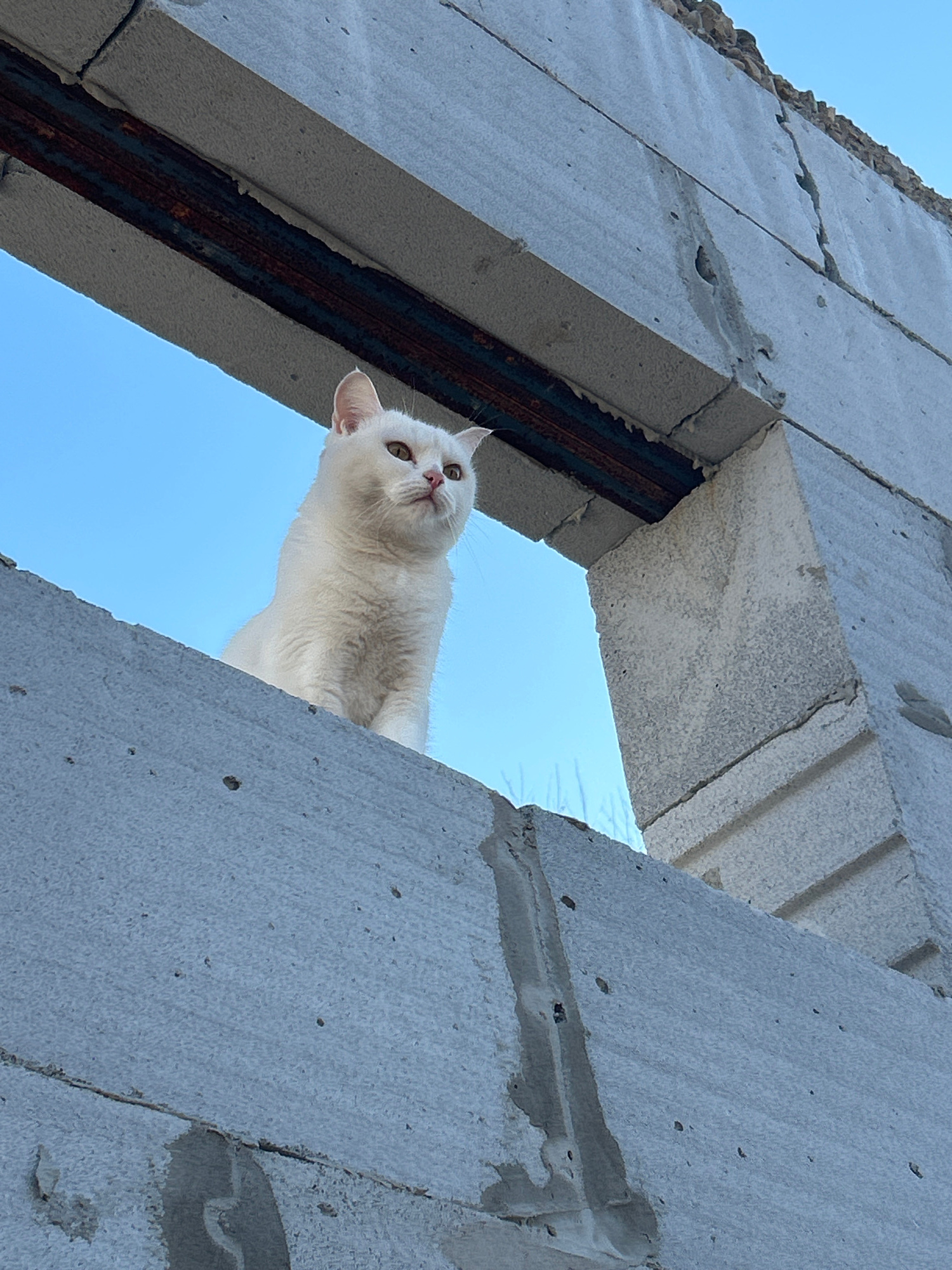 A white cat with light-colored eyes is peering down from an opening in an unfinished concrete block structure, looking directly at the viewer. The image is captured from a low-angle perspective, empha…read more