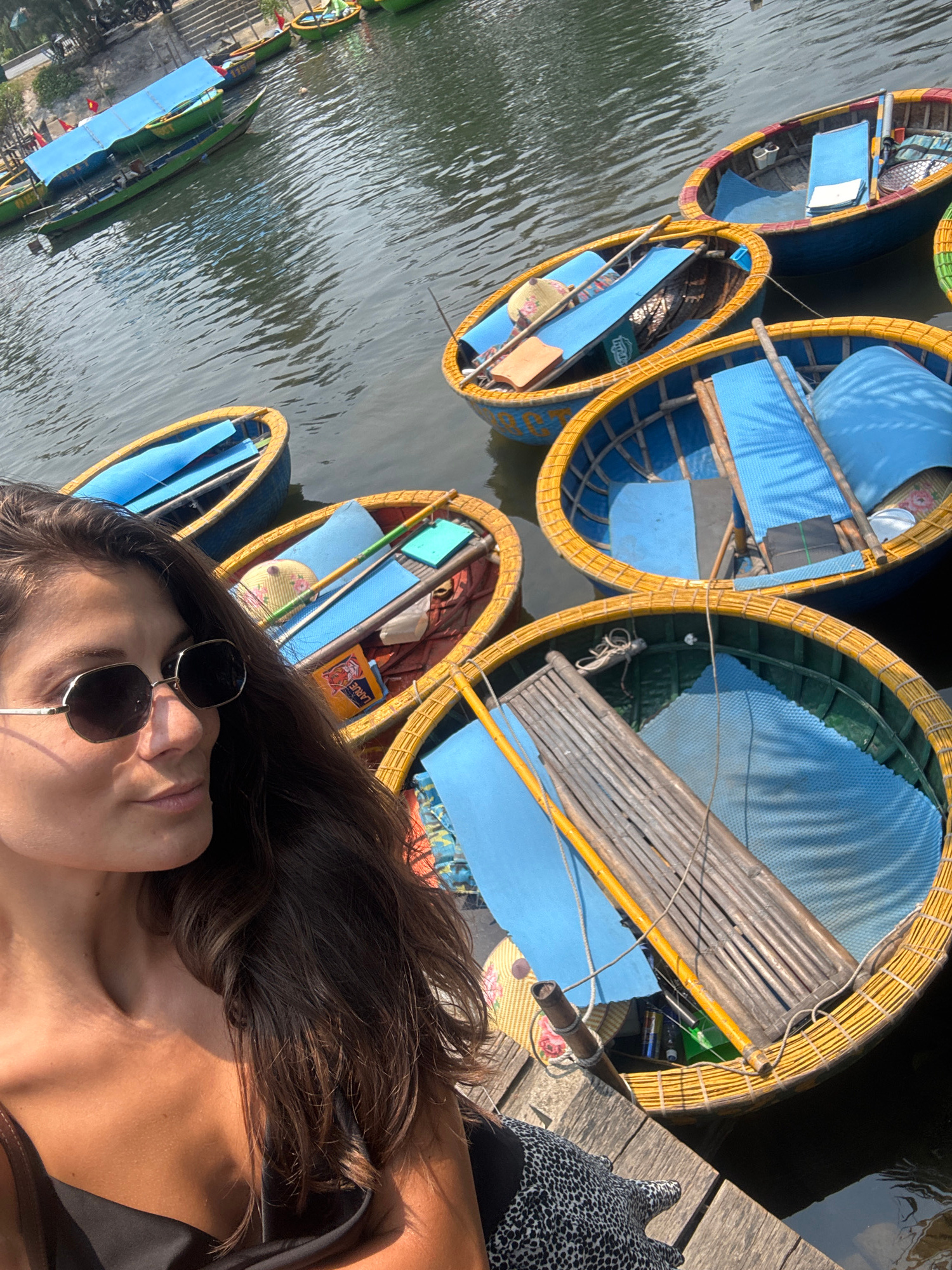 The image captures a high-angle view of a person alongside multiple traditional Vietnamese basket boats (thúng chai) on calm water. In the foreground, a woman with dark, flowing hair, tanned skin, and…read more