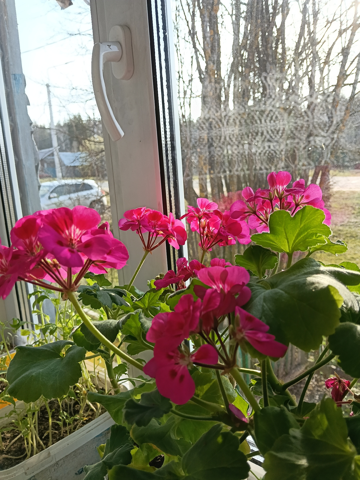 A close-up, eye-level shot showcases a vibrant pink geranium plant situated on a windowsill. The window, likely of a residence in the city of Красный Маяк, Russia, looks out onto a landscape featuring…read more