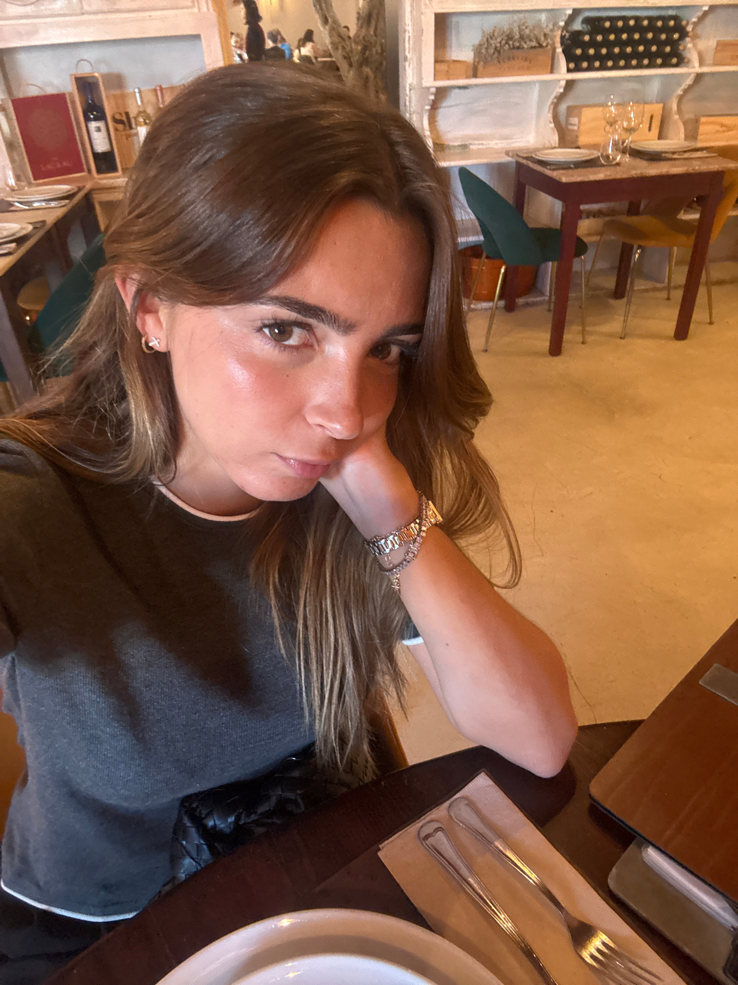 A woman with long brown hair, wearing a dark grey top with a white collar, is captured looking towards the viewer in what appears to be an indoor dining setting in Torres Vedras, Portugal. She has a s…read more