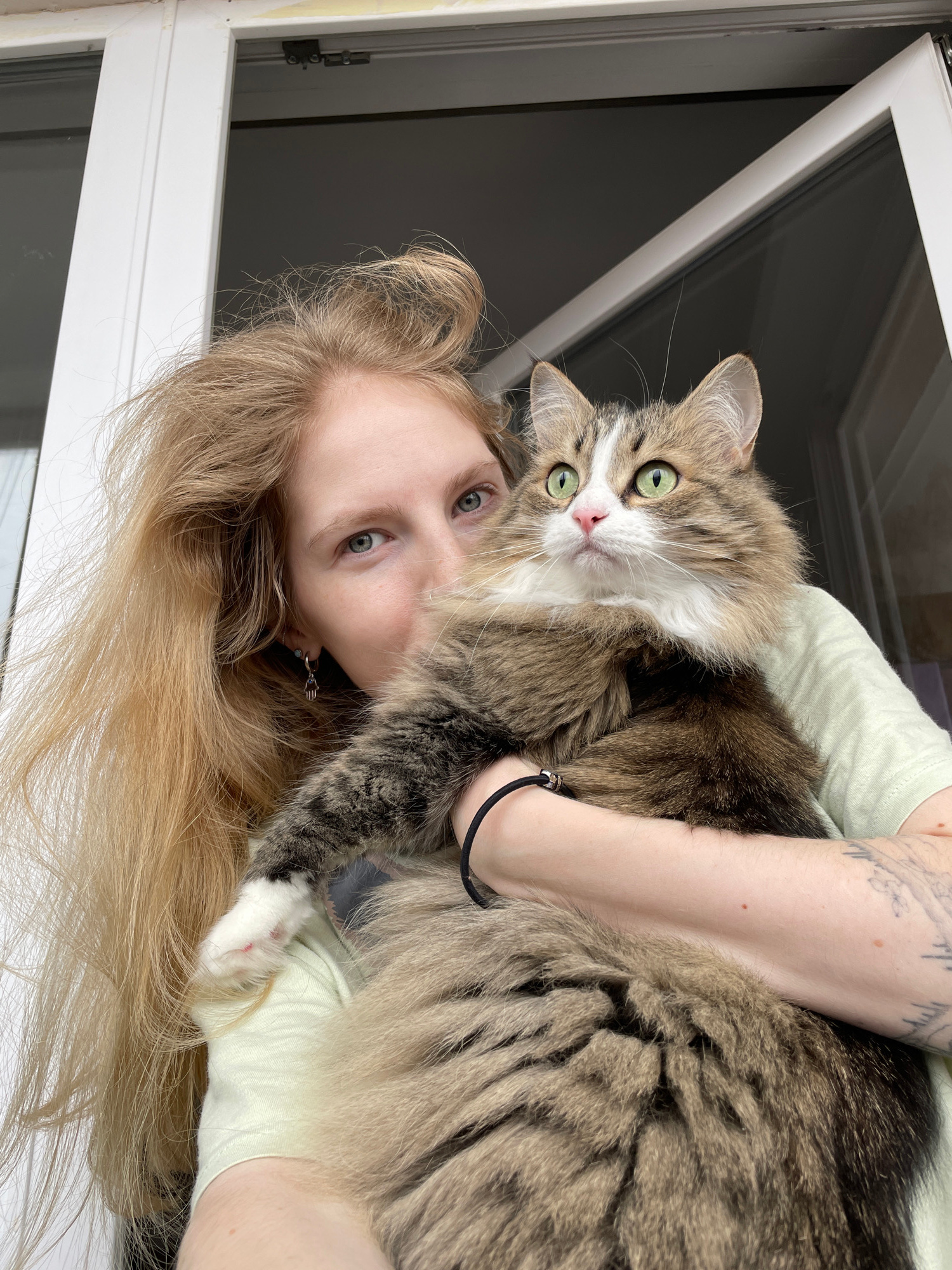 A woman with long blonde hair is holding a fluffy, brown and white cat in front of a window. The cat has green eyes. The woman is wearing a light green shirt. The scene appears to be indoors. The wind…read more