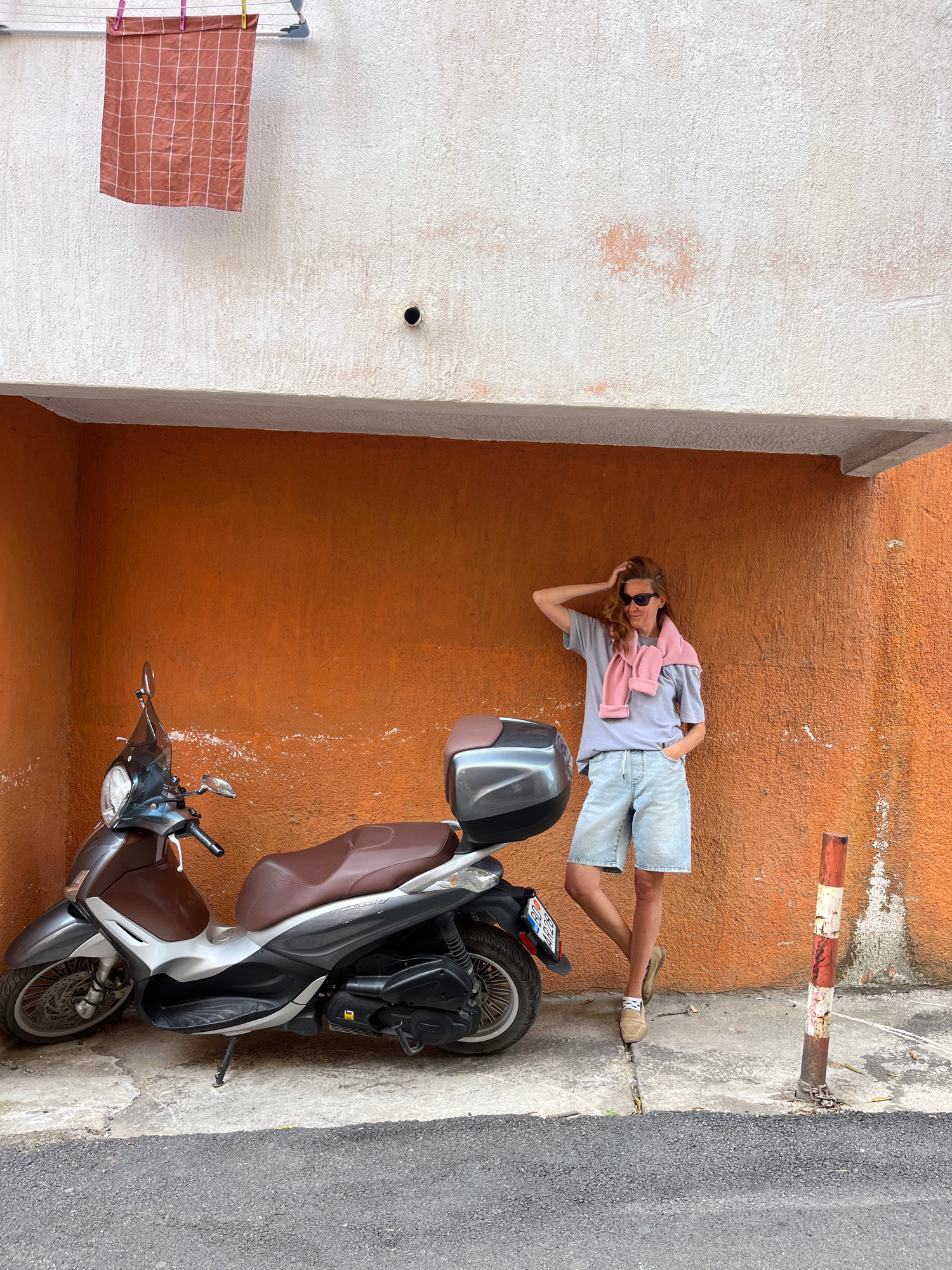 A full-length, eye-level image rotated 90 degrees clockwise shows a man lying against an orange wall next to a parked moped. The man wears sunglasses, a grey shirt, light-wash denim shorts, and tan sh…read more