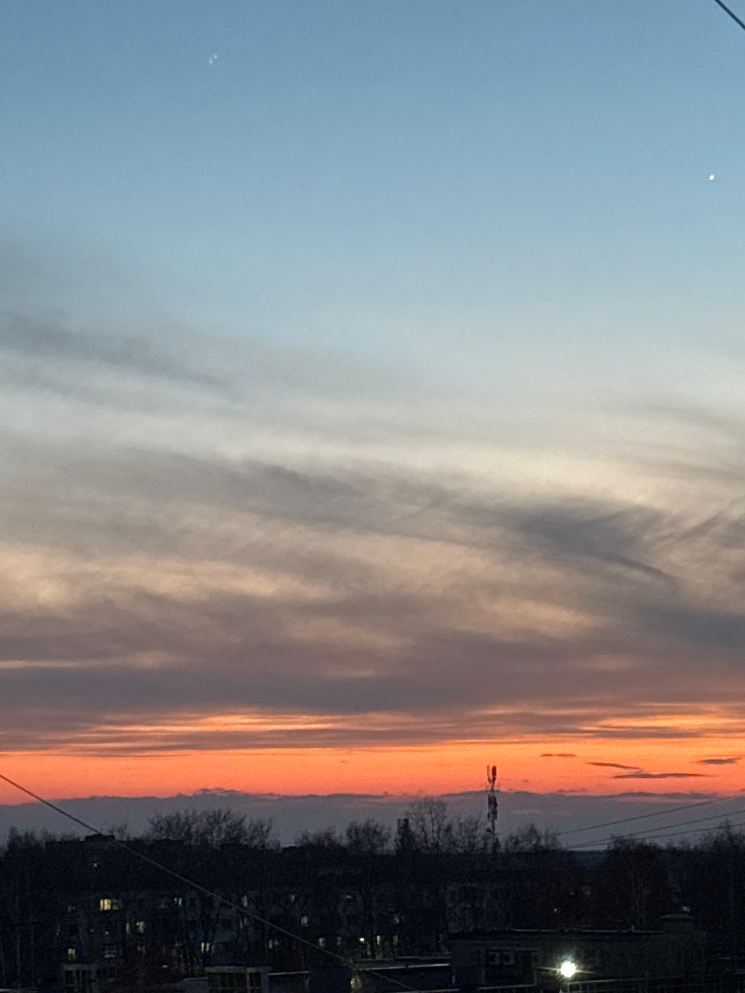 The image shows a sunset in what appears to be a city environment, likely in Chaikovsky, Russia given the prompt. The sky transitions from a pale blue to an orange-red near the horizon, with streaks o…read more