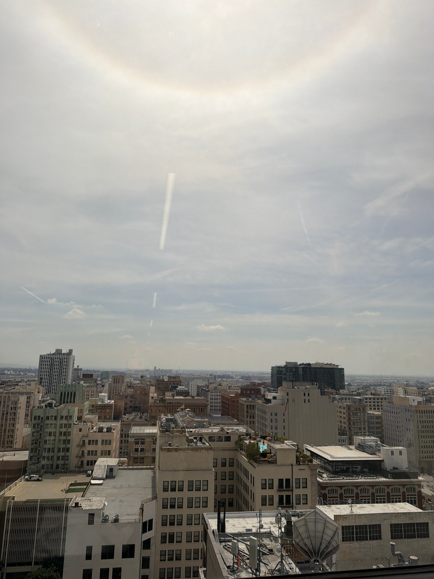 This high-angle photograph captures a dense urban landscape, likely Los Angeles, United States, viewed from a tall building. The scene depicts a sprawling city under a bright, somewhat hazy sky, chara…read more