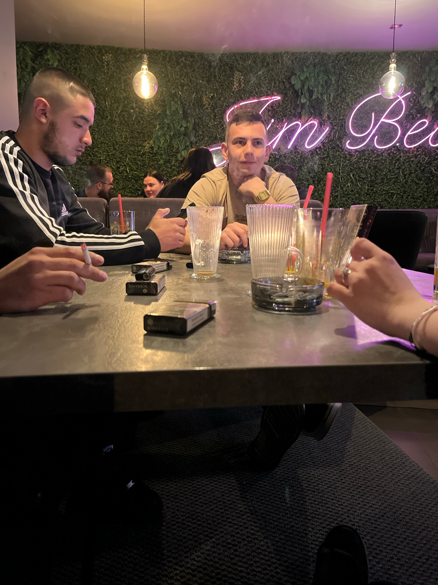 The image shows a group of people at a table in an indoor setting. There are drinks on the table, and at least one person is smoking a cigarette. A sign on the wall behind the group says "In Be". Ciga…read more