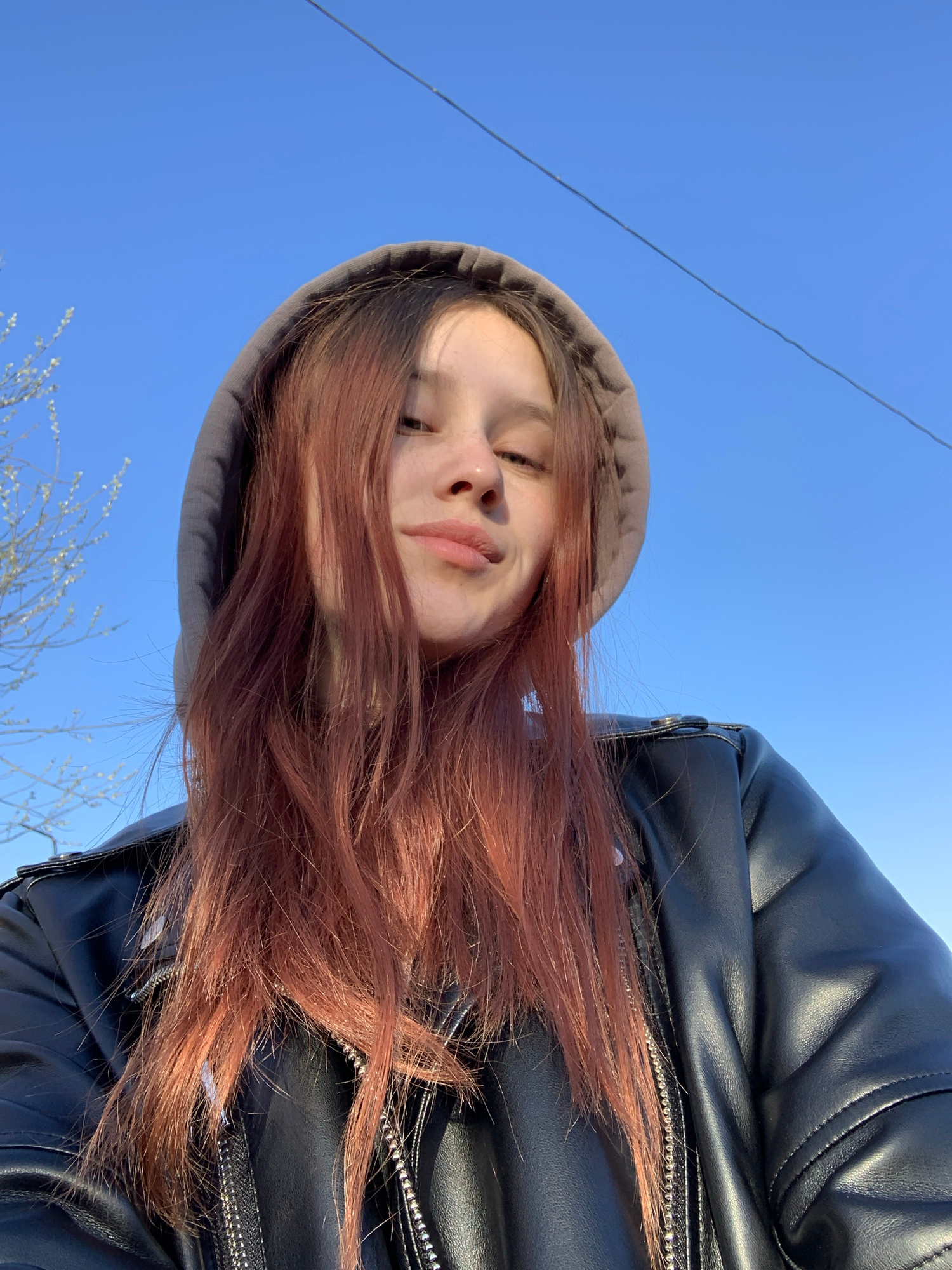 A low-angle, rotated image captures a young person from the shoulders up, looking down towards the camera under a bright blue sky. The individual, with fair skin and long, flowing reddish-brown hair,…read more