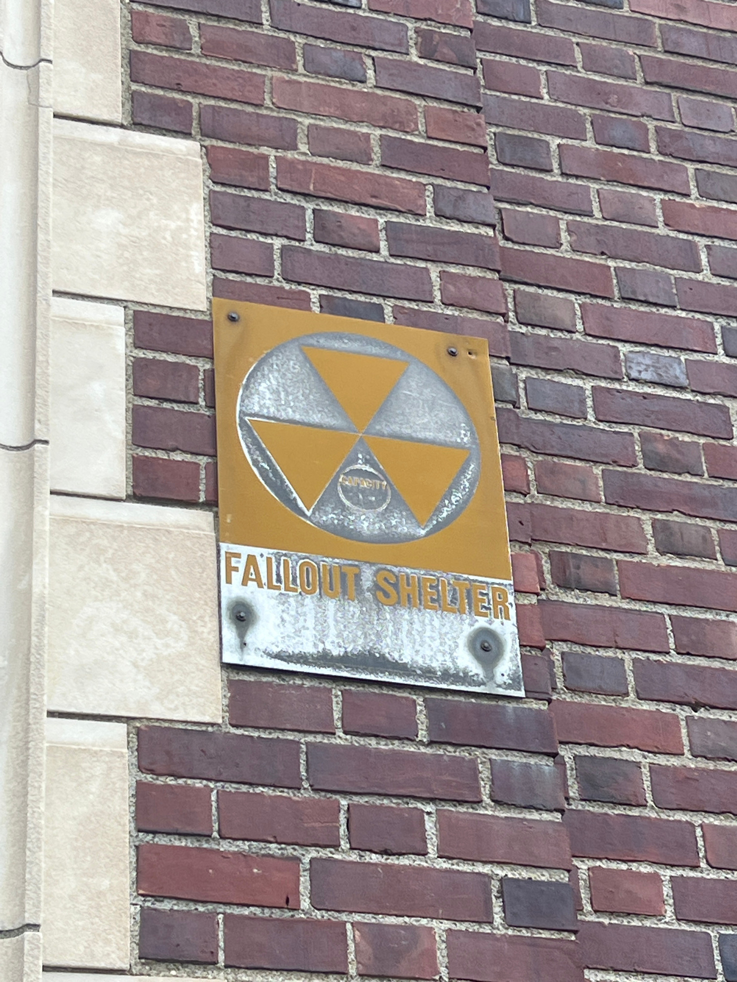 A Fallout Shelter sign is affixed to a brick wall in the City of Newburgh, United States of America. The sign features a radiation trefoil symbol within a circle. The sign reads "Fallout Shelter". The…read more