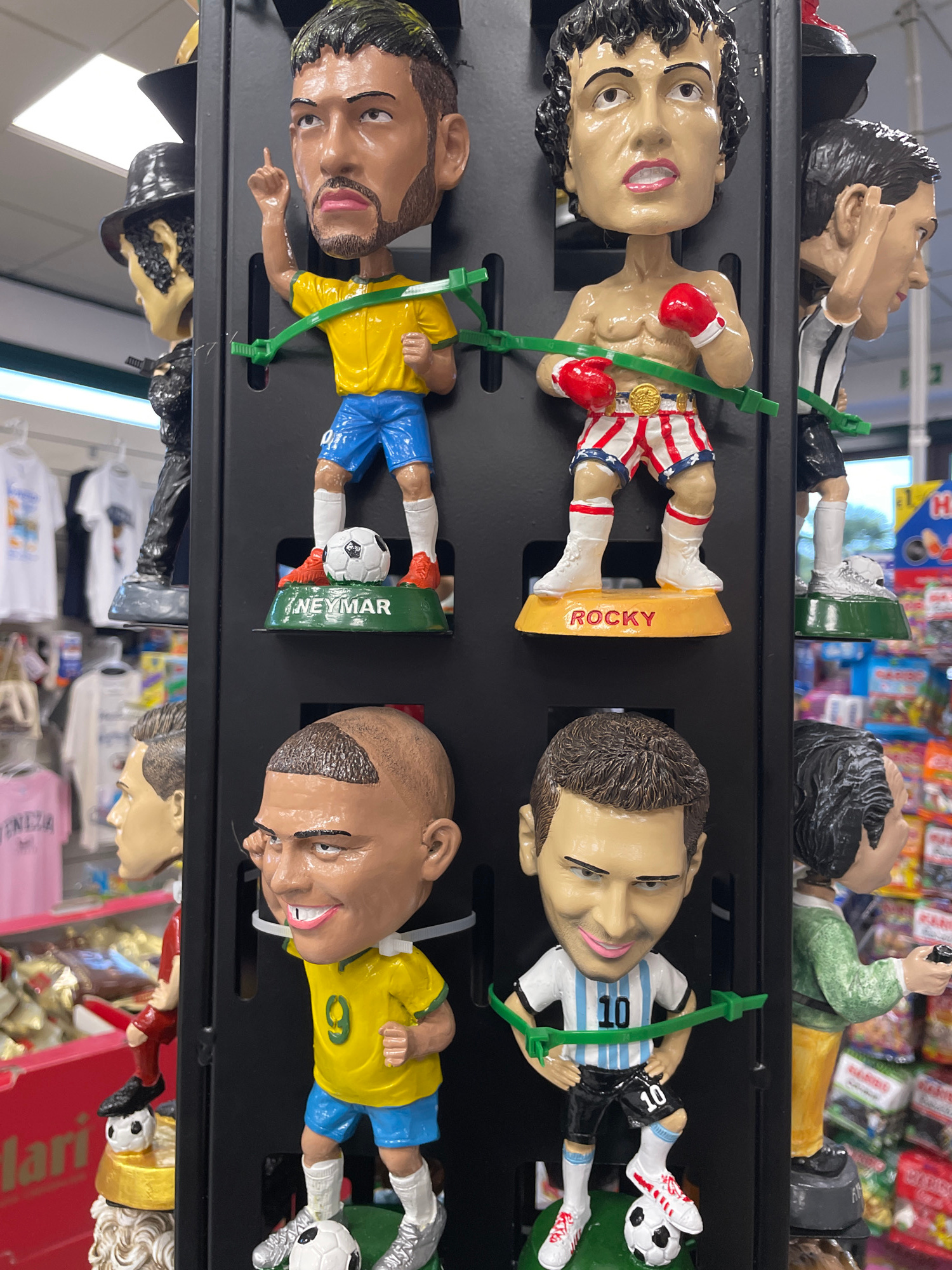 The image shows a retail display of novelty bobblehead figures. The figures are arranged on black shelves. The figures include representations of athletes Neymar and Messi, and the fictional character…read more
