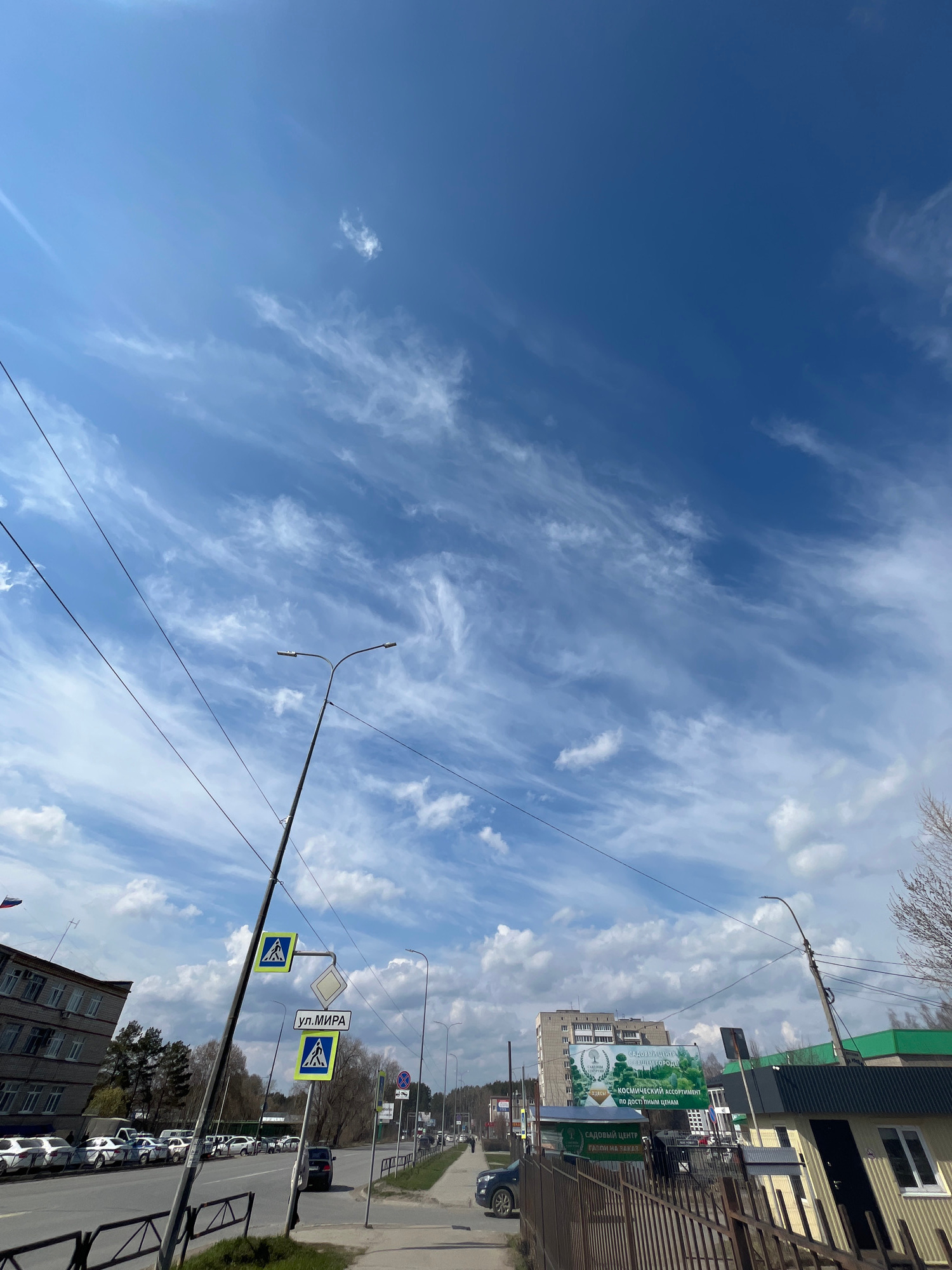 This image captures a bright, daytime street scene in Chaikovsky, Russia. The sky dominates the upper portion, featuring a deep blue expanse dotted with scattered white, wispy cirrus clouds and some l…read more