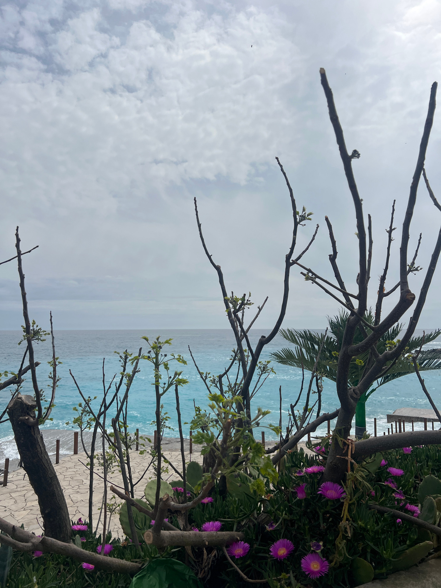 The image depicts a coastal scene in Visnjeva, Montenegro. The foreground is dominated by bare tree branches with some budding leaves, interspersed with purple flowers and greenery growing along a sto…read more